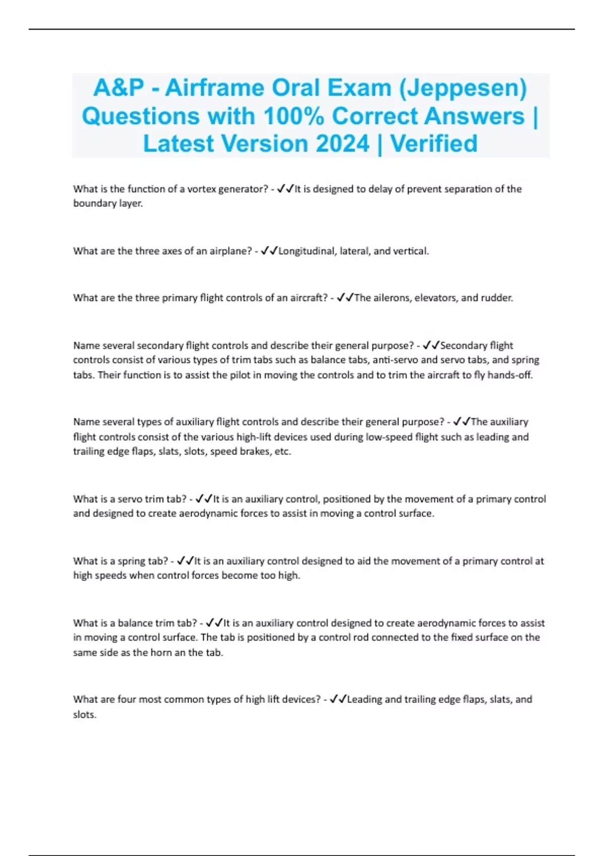 A&P - Airframe Oral Exam (Jeppesen) Questions with 100% Correct Answers | Latest Version 2024 | Verified What is the function of a vortex generator? - It is designed to delay of prevent separation of the boundary layer. What are the three axes of an airplane? - Longitudinal, lateral, and vertical. What are the three primary flight controls of an aircraft? - The ailerons, elevators, and rudder. Name several secondary flight controls and describe their general purpose? - Secondary flight controls consist of various types of trim tabs such as balance tabs, anti-servo and servo tabs, and spring tabs. Their function is to assist the pilot in moving the controls and to trim the aircraft to fly hands-off. Name several types of auxiliary flight controls and describe their general purpose? - The auxiliary flight controls consist of the various high-lift devices used during low-speed flight such as leading and trailing edge flaps, slats, slots, speed brakes, etc. What is a servo trim tab? - It is an auxiliary control, positioned by the movement of a primary control and designed to create aerodynamic forces to assist in moving a control surface. What is a spring tab? - It is an auxiliary control designed to aid the movement of a primary control at high speeds when control forces become too high. What is a balance trim tab? - It is an auxiliary control designed to create aerodynamic forces to assist in moving a control surface. The tab is positioned by a control rod connected to the fixed surface on the same side as the horn an the tab. What are four most common types of high lift devices? - Leading and trailing edge flaps, slats, and slots. Describe some of the tools used to check control surface travel? - A universal propeller protractor or specal control surface protractor. Name three mechanical methods by which flight control systems may be actuated. - Cables, push- pull rods, and torque tubes. What is a fairlead? - It is a device to prevent a cable from rubbing on the aircraft strcture. What are the most likely places for a control cable to wear or break? - Where the cables pass over pulleys or through fairleads. What information is required before a cable rigging chart can be used? - The ambient temperature and the cable size. What is the function of a cable tension regulator? - It automatically adjusts the cable tension to compensate for expansion and contraction in the aircraft structure. Describe the function of rotorcraft collective pitch control. - The collective control causes each rotor blade to change its pitch angle by the same amount, thus increasing or decreasing the lift produced by the rotor. Describe the function of a rotorcraft cyclic pitch control. - The cyclic control tilts the main rotor disc by by changing the pitch angle of each rotor blade during its cycle of rotation, which causes the helicopter to move in the direction the rotor tilts. What mechanism is most commonly used to compensate for the torque produced by the main rotor of a helicopter? - The tail (or anti-torque) rotor. How is the amount of thrust produced by the tail rotor controlled? - By moving the foot pedals. Why should a control surface be locked when an aircraft is parked? - To prevent damage from the wind. What is the major type of damage to aluminum structures that is caused by exposure to the weather? - Corrosion. Name several method for forming sheet metal. - Bending or folding, stretching, shrinking, bumping, and crimping. What are the dimensions of a properly formed rivet head? - The head should be 1-1/2 times the shank diameter in width and 1/2 the shank diameter in height. Describe the markings found on the heads of A, B, D, AD, and DD rivets? - A rivets are plain, B rivets have a cross, D rivets have a raised dot, AD rivets have a dimple, and DD rivets have a double dash. What happens to the stem of a self-plugging (friction lock) rivet when the rivet is installed? - The stem is pulled until it snaps off and the remaining projecting part is trimmed flush with the head. Name at least three types of self-plugging mechanical lock rivets. - CherryMAX, CherryLOCK, OLYMPIC-LOK, and HuckLok. What is the difference between the tools required to pull a CherryLOCK rivet and a CherryMAX rivet? - CherryLock rivets require a tool for each different size and