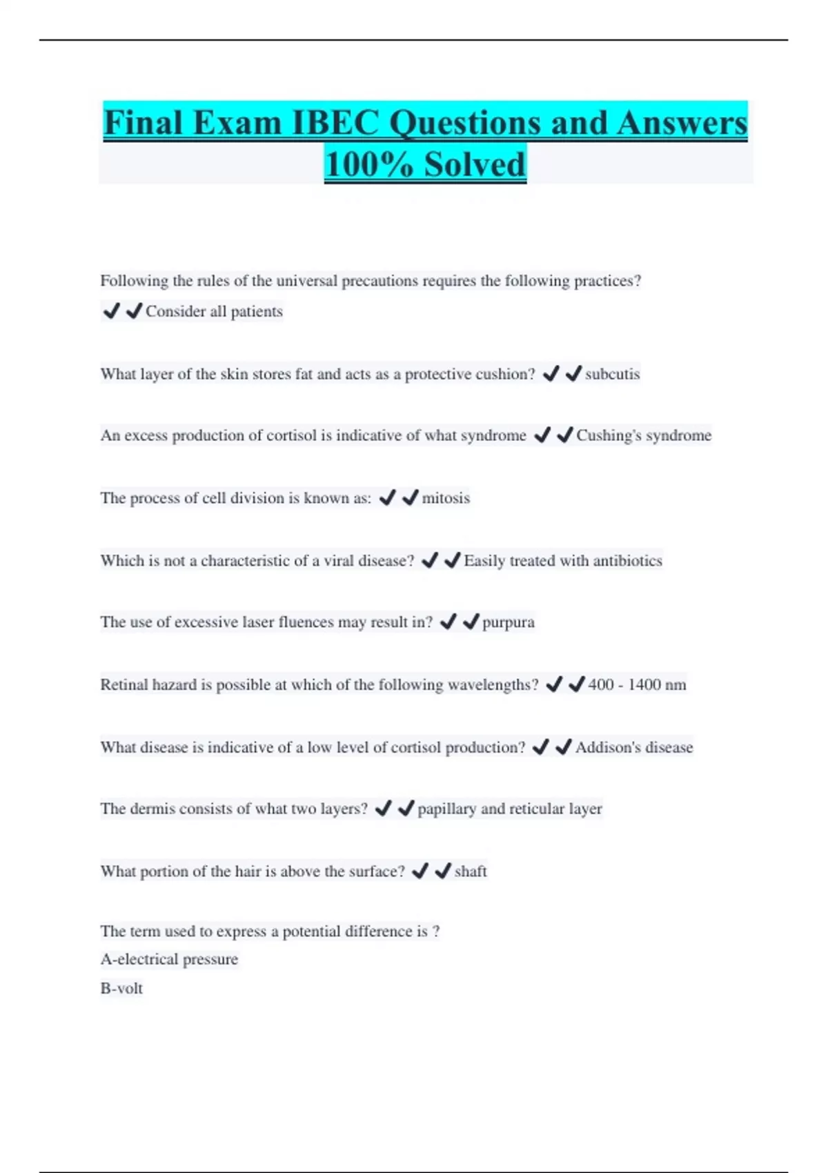 Final Exam IBEC Questions and Answers 100% Solved Following the rules of the universal precautions requires the following practices? ️️Consider all patients What layer of the skin stores fat and acts as a protective cushion? ️️subcutis An excess production of cortisol is indicative of what syndrome ️️Cushing's syndrome The process of cell division is known as: ️️mitosis Which is not a characteristic of a viral disease? ️️Easily treated with antibiotics The use of excessive laser fluences may result in? ️️purpura Retinal hazard is possible at which of the following wavelengths? ️️400 - 1400 nm What disease is indicative of a low level of cortisol production? ️️Addison's disease The dermis consists of what two layers? ️️papillary and reticular layer
