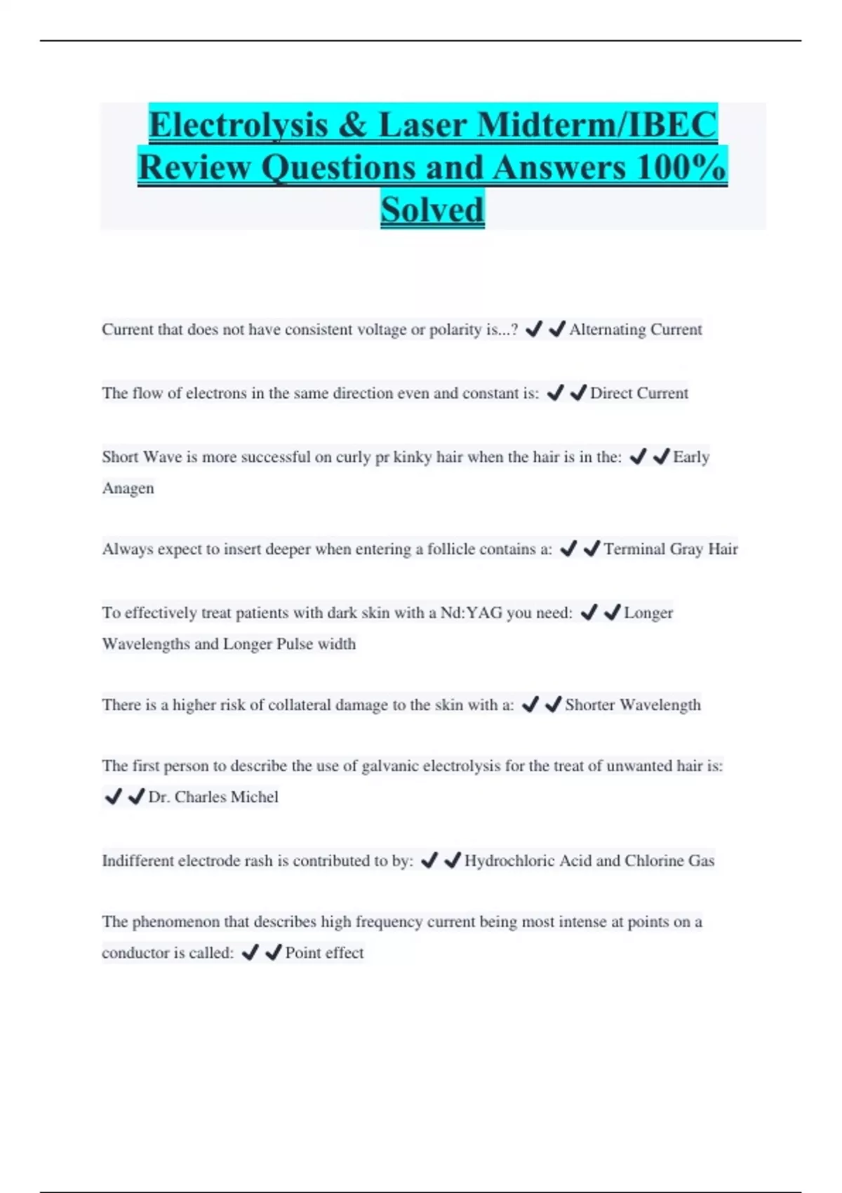 Electrolysis & Laser Midterm/IBEC Review Questions and Answers 100% Solved Current that does not have consistent voltage or polarity is...? ️️Alternating Current The flow of electrons in the same direction even and constant is: ️️Direct Current Short Wave is more successful on curly pr kinky hair when the hair is in the: ️️Early Anagen Always expect to insert deeper when entering a follicle contains a: ️️Terminal Gray Hair To effectively treat patients with dark skin with a Nd:YAG you need: ️️Longer Wavelengths and Longer Pulse width There is a higher risk of collateral damage to the skin with a: ️️Shorter Wavelength The first person to describe the use of galvanic electrolysis for the treat of unwanted hair is: ️️Dr. Charles Michel