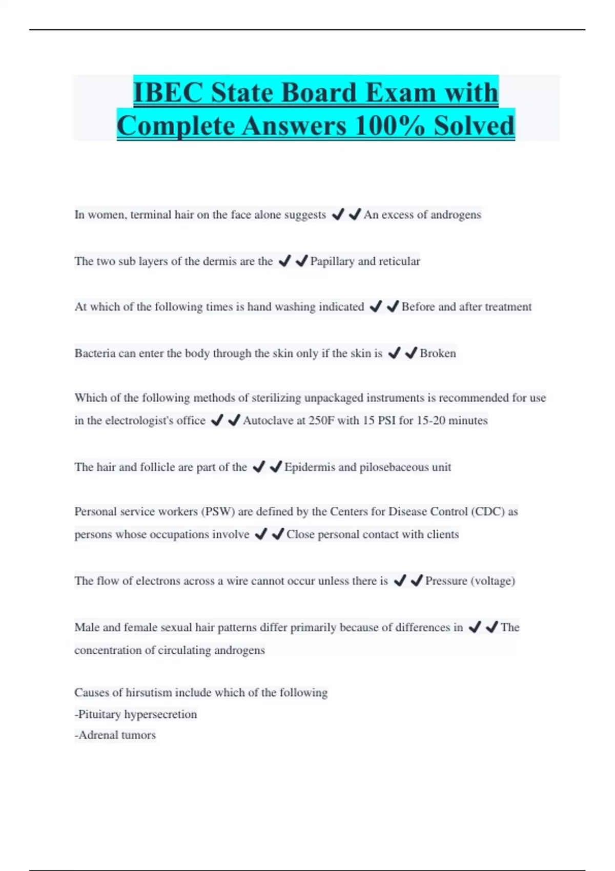 IBEC State Board Exam with Complete Answers 100% Solved In women, terminal hair on the face alone suggests ️️An excess of androgens The two sub layers of the dermis are the ️️Papillary and reticular At which of the following times is hand washing indicated ️️Before and after treatment Bacteria can enter the body through the skin only if the skin is ️️Broken Which of the following methods of sterilizing unpackaged instruments is recommended for use in the electrologist's office ️️Autoclave at 250F with 15 PSI for 15-20 minutes The hair and follicle are part of the ️️Epidermis and pilosebaceous unit Personal service workers (PSW) are defined by the Centers for Disease Control (CDC) as persons whose occupations involve ️️Close personal contact with clients The flow of electrons across a wire cannot occur unless there is ️️Pressure (voltage) Male and female sexual hair patterns differ primarily because of differences in ️️The concentration of circulating androgens
