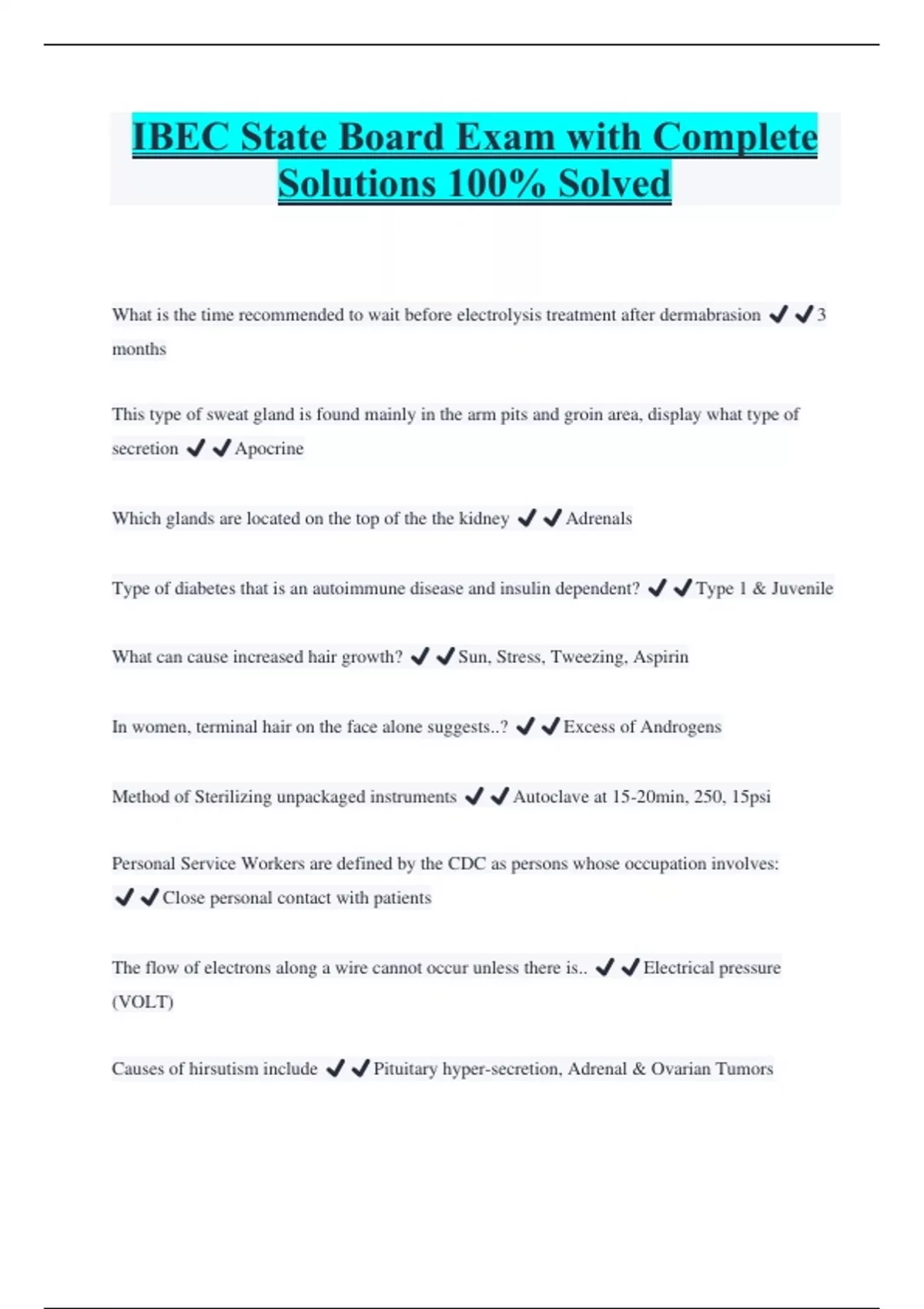 IBEC State Board Exam with Complete Solutions 100% Solved What is the time recommended to wait before electrolysis treatment after dermabrasion ️️3 months This type of sweat gland is found mainly in the arm pits and groin area, display what type of secretion ️️Apocrine Which glands are located on the top of the the kidney ️️Adrenals Type of diabetes that is an autoimmune disease and insulin dependent? ️️Type 1 & Juvenile What can cause increased hair growth? ️️Sun, Stress, Tweezing, Aspirin In women, terminal hair on the face alone suggests..? ️️Excess of Androgens Method of Sterilizing unpackaged instruments ️️Autoclave at 15-20min, 250, 15psi Personal Service Workers are defined by the CDC as persons whose occupation involves: ️️Close personal contact with patients