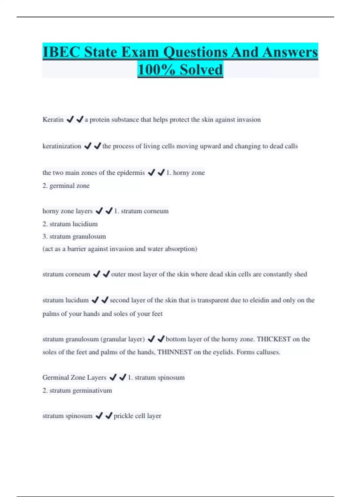 IBEC State Exam Questions And Answers 100% Solved Keratin ️️a protein substance that helps protect the skin against invasion keratinization ️️the process of living cells moving upward and changing to dead calls the two main zones of the epidermis ️️1. horny zone 2. germinal zone horny zone layers ️️1. stratum corneum 2. stratum lucidium 3. stratum granulosum (act as a barrier against invasion and water absorption) stratum corneum ️️outer most layer of the skin where dead skin cells are constantly shed stratum lucidum ️️second layer of the skin that is transparent due to eleidin and only on the palms of your hands and soles of your feet