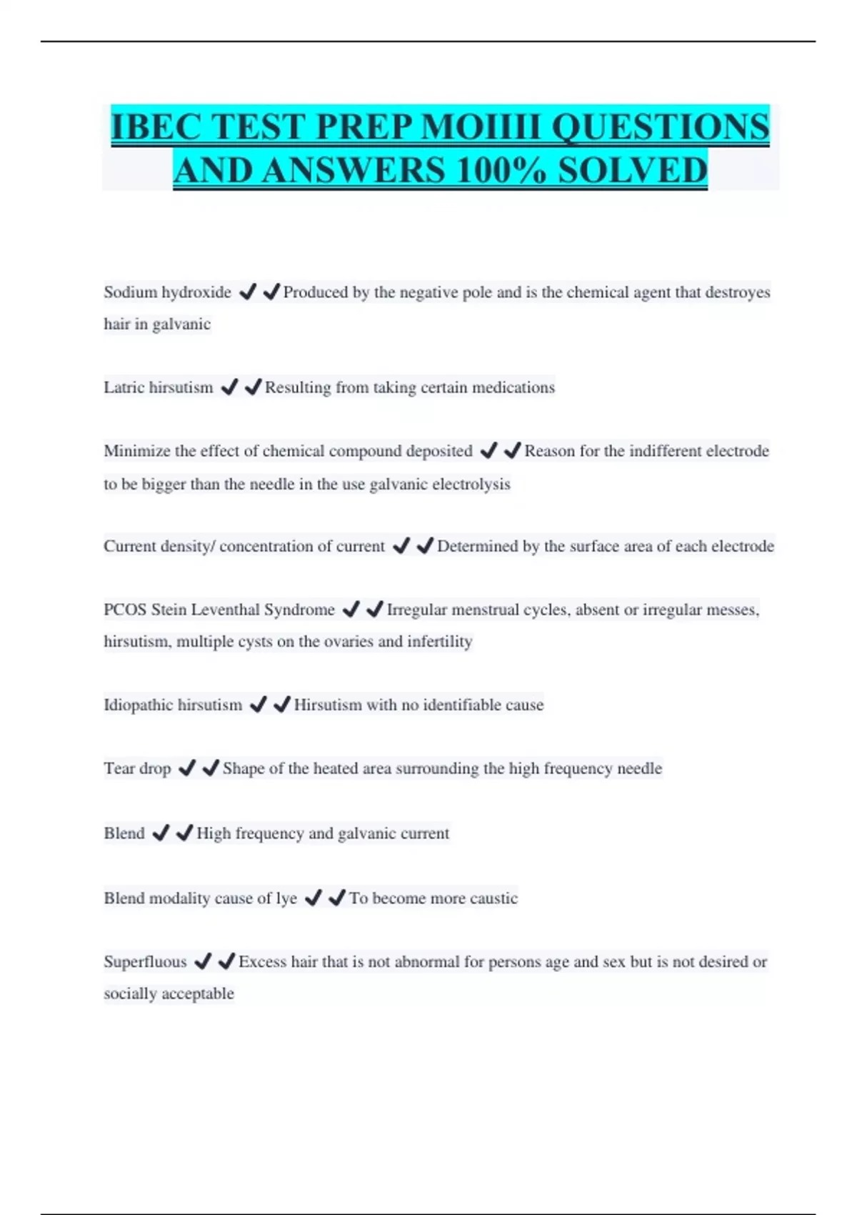 IBEC TEST PREP MOIIII QUESTIONS AND ANSWERS 100% SOLVED Sodium hydroxide ️️Produced by the negative pole and is the chemical agent that destroyes hair in galvanic Latric hirsutism ️️Resulting from taking certain medications Minimize the effect of chemical compound deposited ️️Reason for the indifferent electrode to be bigger than the needle in the use galvanic electrolysis Current density/ concentration of current ️️Determined by the surface area of each electrode PCOS Stein Leventhal Syndrome ️️Irregular menstrual cycles, absent or irregular messes, hirsutism, multiple cysts on the ovaries and infertility