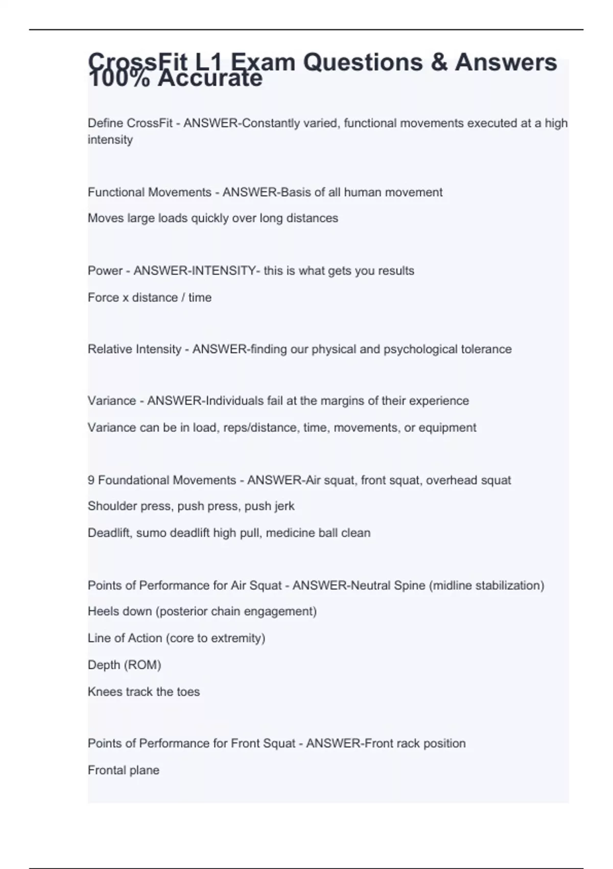 Define CrossFit - ANSWER-Constantly varied, functional movements executed at a high intensity Functional Movements - ANSWER-Basis of all human movement Moves large loads quickly over long distances Power - ANSWER-INTENSITY- this is what gets you results Force x distance / time Relative Intensity - ANSWER-finding our physical and psychological tolerance Variance - ANSWER-Individuals fail at the margins of their experience Variance can be in load, reps/distance, time, movements, or equipment 9 Foundational Movements - ANSWER-Air squat, front squat, overhead squat Shoulder press, push press, push jerk Deadlift, sumo deadlift high pull, medicine ball clean Points of Performance for Air Squat - ANSWER-Neutral Spine (midline stabilization) Heels down (posterior chain engagement) Line of Action (core to extremity) Depth (ROM) Knees track the toes Points of Performance for Front Squat - ANSWER-Front rack position