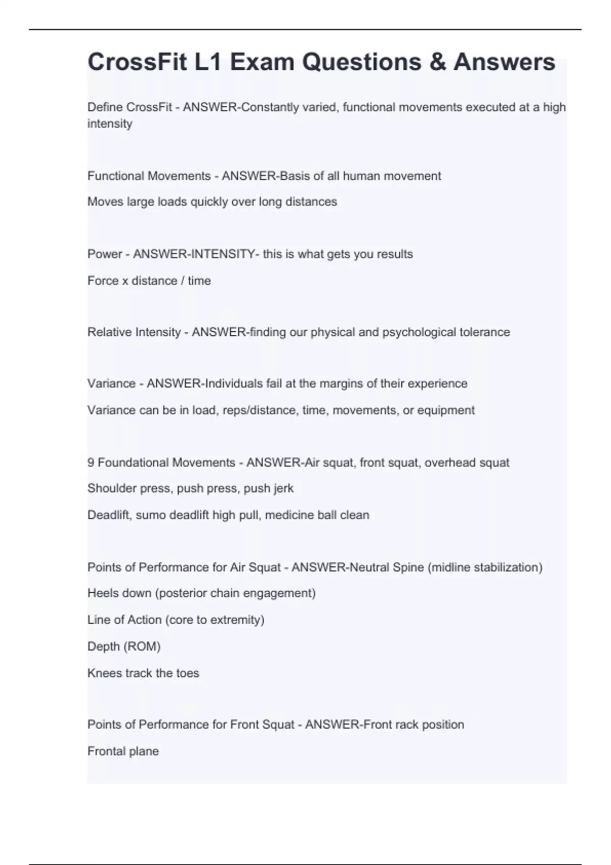 Define CrossFit - ANSWER-Constantly varied, functional movements executed at a high intensity Functional Movements - ANSWER-Basis of all human movement Moves large loads quickly over long distances Power - ANSWER-INTENSITY- this is what gets you results Force x distance / time Relative Intensity - ANSWER-finding our physical and psychological tolerance Variance - ANSWER-Individuals fail at the margins of their experience Variance can be in load, reps/distance, time, movements, or equipment 9 Foundational Movements - ANSWER-Air squat, front squat, overhead squat Shoulder press, push press, push jerk Deadlift, sumo deadlift high pull, medicine ball clean Points of Performance for Air Squat - ANSWER-Neutral Spine (midline stabilization) Heels down (posterior chain engagement) Line of Action (core to extremity) Depth (ROM) Knees track the toes Points of Performance for Front Squat - ANSWER-Front rack position Frontal plane
