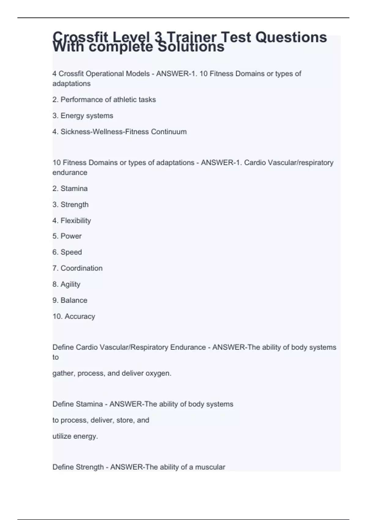 4 Crossfit Operational Models - ANSWER-1. 10 Fitness Domains or types of adaptations 2. Performance of athletic tasks 3. Energy systems 4. Sickness-Wellness-Fitness Continuum 10 Fitness Domains or types of adaptations - ANSWER-1. Cardio Vascular/respiratory endurance 2. Stamina 3. Strength 4. Flexibility 5. Power 6. Speed 7. Coordination 8. Agility 9. Balance 10. Accuracy Define Cardio Vascular/Respiratory Endurance - ANSWER-The ability of body systems to gather, process, and deliver oxygen. Define Stamina - ANSWER-The ability of body systems to process, deliver, store, and utilize energy.