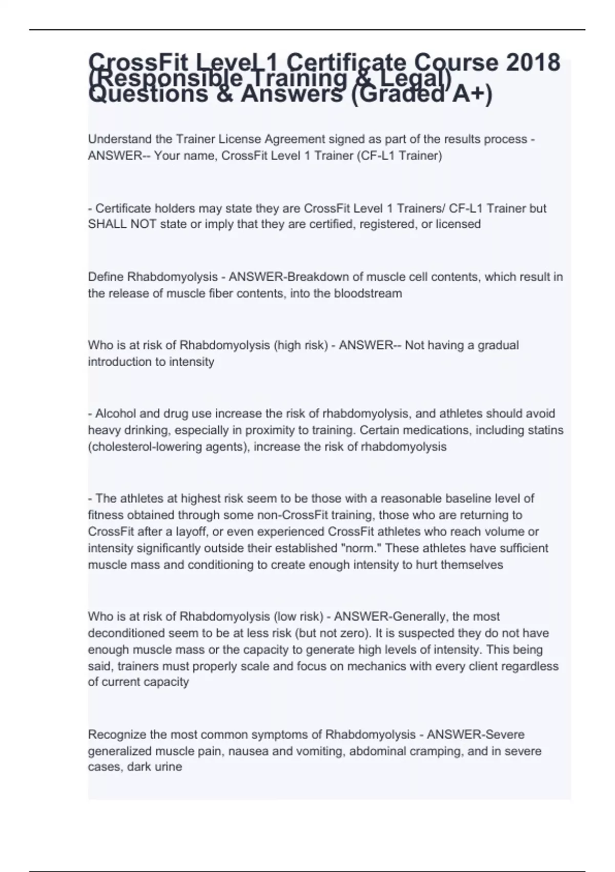 Understand the Trainer License Agreement signed as part of the results process - ANSWER-- Your name, CrossFit Level 1 Trainer (CF-L1 Trainer) - Certificate holders may state they are CrossFit Level 1 Trainers/ CF-L1 Trainer but SHALL NOT state or imply that they are certified, registered, or licensed Define Rhabdomyolysis - ANSWER-Breakdown of muscle cell contents, which result in the release of muscle fiber contents, into the bloodstream Who is at risk of Rhabdomyolysis (high risk) - ANSWER-- Not having a gradual introduction to intensity - Alcohol and drug use increase the risk of rhabdomyolysis, and athletes should avoid heavy drinking, especially in proximity to training. Certain medications, including statins (cholesterol-lowering agents), increase the risk of rhabdomyolysis - The athletes at highest risk seem to be those with a reasonable baseline level of fitness obtained through some non-CrossFit training, those who are returning to CrossFit after a layoff, or even experienced CrossFit athletes who reach volume or intensity significantly outside their established "norm." These athletes have sufficient muscle mass and conditioning to create enough intensity to hurt themselves Who is at risk of Rhabdomyolysis (low risk) - ANSWER-Generally, the most deconditioned seem to be at less risk (but not zero). It is suspected they do not have enough muscle mass or the capacity to generate high levels of intensity. This being said, trainers must properly scale and focus on mechanics with every client regardless of current capacity