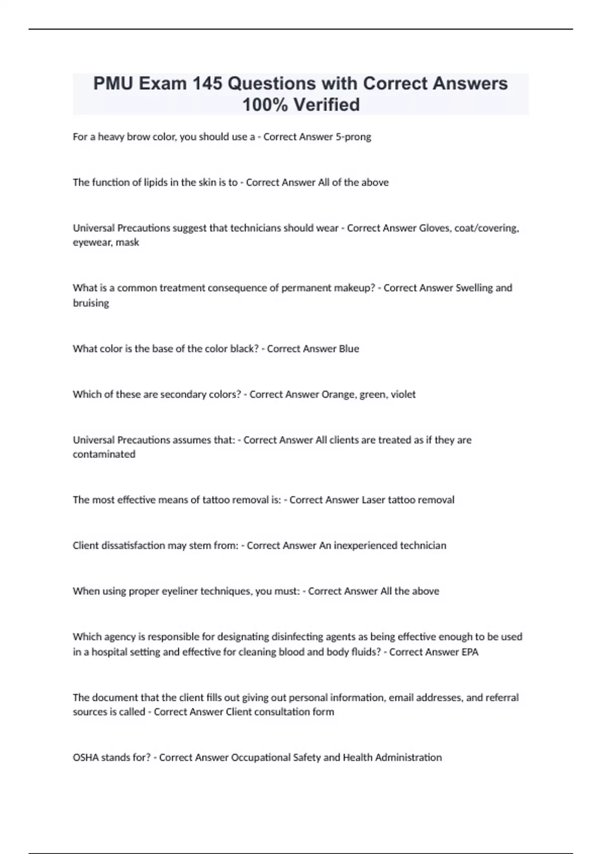 PMU Exam 145 Questions with Correct Answers 100% Verified For a heavy brow color, you should use a - Correct Answer 5-prong The function of lipids in the skin is to - Correct Answer All of the above Universal Precautions suggest that technicians should wear - Correct Answer Gloves, coat/covering, eyewear, mask What is a common treatment consequence of permanent makeup? - Correct Answer Swelling and bruising What color is the base of the color black? - Correct Answer Blue Which of these are secondary colors? - Correct Answer Orange, green, violet Universal Precautions assumes that: - Correct Answer All clients are treated as if they are contaminated The most effective means of tattoo removal is: - Correct Answer Laser tattoo removal Client dissatisfaction may stem from: - Correct Answer An inexperienced technician When using proper eyeliner techniques, you must: - Correct Answer All the above Which agency is responsible for designating disinfecting agents as being effective enough to be used in a hospital setting and effective for cleaning blood and body fluids? - Correct Answer EPA The document that the client fills out giving out personal information, email addresses, and referral sources is called - Correct Answer Client consultation form OSHA stands fo