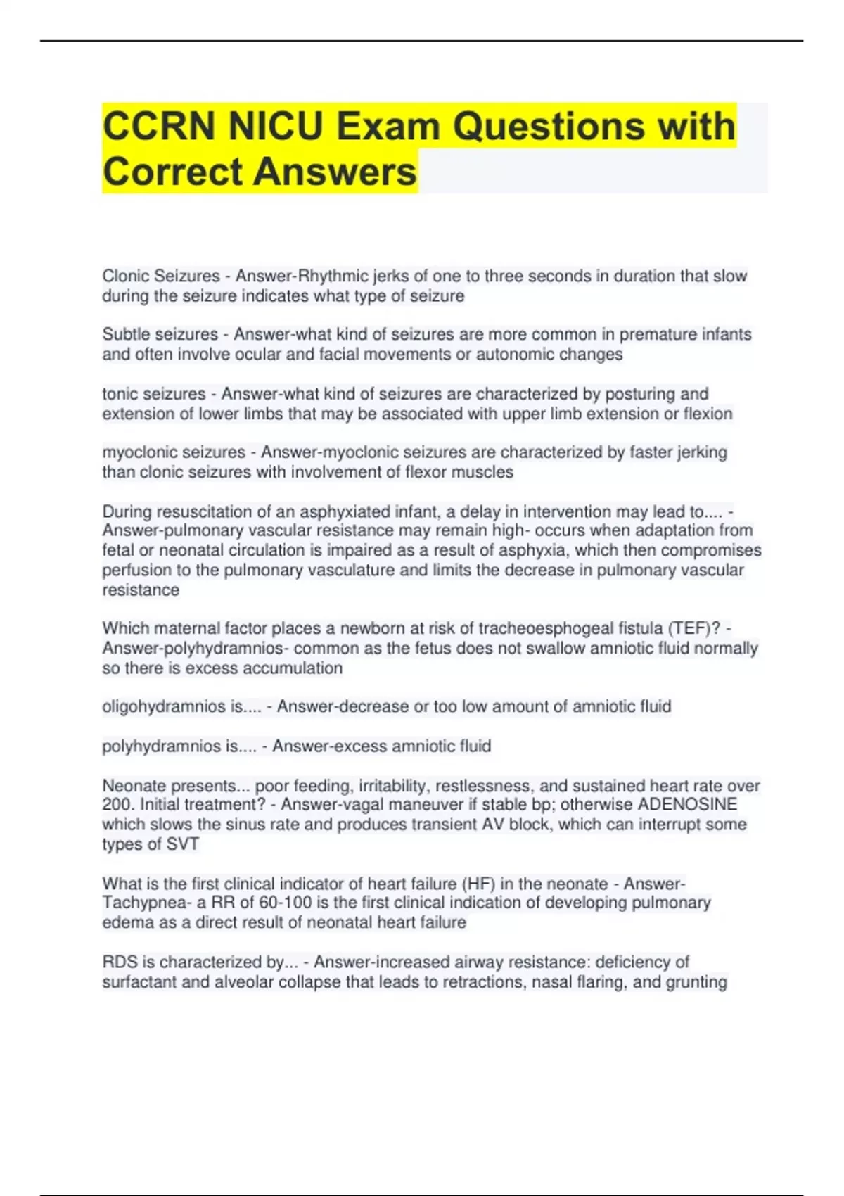 CCRN NICU Exam Questions with Correct Answers Clonic Seizures - Answer-Rhythmic jerks of one to three seconds in duration that slow during the seizure indicates what type of seizure Subtle seizures - Answer-what kind of seizures are more common in premature infants and often involve ocular and facial movements or autonomic changes tonic seizures - Answer-what kind of seizures are characterized by posturing and extension of lower limbs that may be associated with upper limb extension or flexion myoclonic seizures - Answer-myoclonic seizures are characterized by faster jerking than clonic seizures with involvement of flexor muscles During resuscitation of an asphyxiated infant, a delay in intervention may lead to.... - Answer-pulmonary vascular resistance may remain high- occurs when adaptation from fetal or neonatal circulation is impaired as a result of asphyxia, which then compromises perfusion to the pulmonary vasculature and limits the decrease in pulmonary vascular resistance Which maternal factor places a newborn at risk of tracheoesphogeal fistula (TEF)? - Answer-polyhydramnios- common as the fetus does not swallow amniotic fluid normally so there is excess accumulation oligohydramnios is.... - Answer-decrease or too low amount of amniotic fluid polyhydramnios is.... - Answer-excess amniotic fluid Neonate presents... poor feeding, irritability, restlessness, and sustained heart rate over 200. Initial treatment? - Answer-vagal maneuver if stable bp; otherwise ADENOSINE which slows the sinus rate and produces transient AV block, which can interrupt some types of SVT What is the first clinical indicator of heart failure (HF) in the neonate - AnswerTachypnea- a RR of 60-100 is the first clinical indication of developing pulmonary edema as a direct result of neonatal heart failure RDS is characterized by... - Answer-increased airway resistance: deficiency of surfactant and alveolar collapse that leads to retractions, nasal flaring, and grunting The clinical presentation for a 5 day old neonate with patent ductus arteriosis (PDA) would include... - Answer-WIDENING pulse pressures and cardiomegaly- due to aortic runoff and volume overload of the left ventricle so the peripheral pulses are bounding