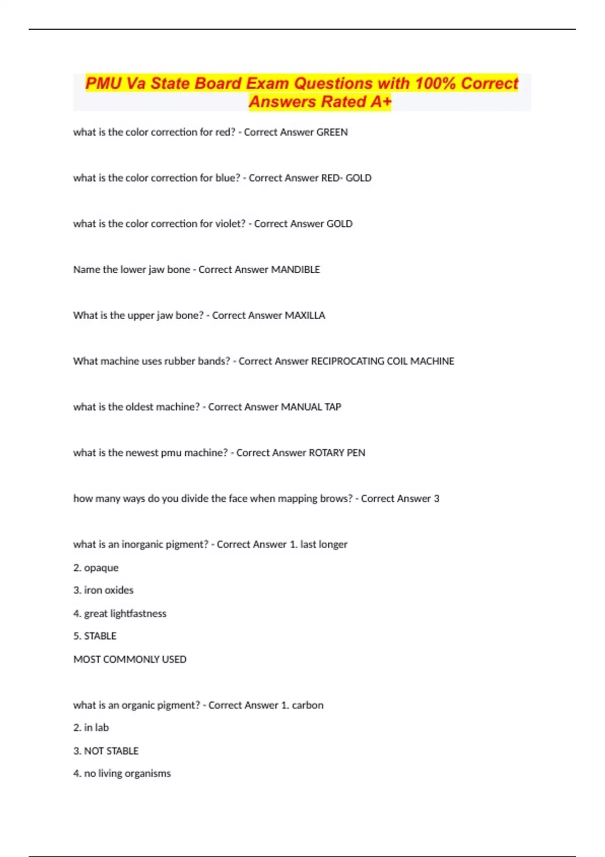 PMU Va State Board Exam Questions with 100% Correct Answers Rated A+ what is the color correction for red? - Correct Answer GREEN what is the color correction for blue? - Correct Answer RED- GOLD what is the color correction for violet? - Correct Answer GOLD Name the lower jaw bone - Correct Answer MANDIBLE What is the upper jaw bone? - Correct Answer MAXILLA What machine uses rubber bands? - Correct Answer RECIPROCATING COIL MACHINE what is the oldest machine? - Correct Answer MANUAL TAP what is the newest pmu machine? - Correct Answer ROTARY PEN how many ways do you divide the face when mapping brows? - Correct Answer 3 what is an inorganic pigment? - Correct Answer 1. last longer 2. opaque 3. iron oxides 4. great lightfastness 5. STABLE MOST COMMONLY USED what is an organic pigment? - Correct Answer 1. carbon 2. in lab 3. NOT STABLE 4. no living organisms
