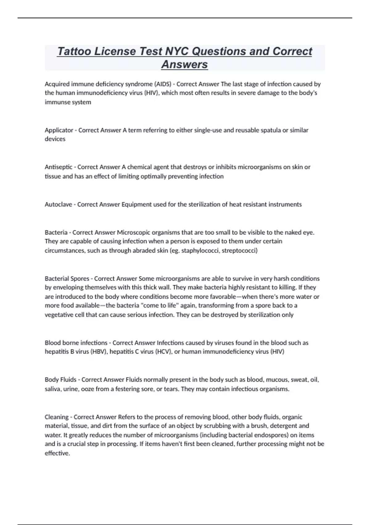 Tattoo License Test NYC Questions and Correct Answers Acquired immune deficiency syndrome (AIDS) - Correct Answer The last stage of infection caused by the human immunodeficiency virus (HIV), which most often results in severe damage to the body's immunse system Applicator - Correct Answer A term referring to either single-use and reusable spatula or similar devices Antiseptic - Correct Answer A chemical agent that destroys or inhibits microorganisms on skin or tissue and has an effect of limiting optimally preventing infection Autoclave - Correct Answer Equipment used for the sterilization of heat resistant instruments Bacteria - Correct Answer Microscopic organisms that are too small to be visible to the naked eye. They are capable of causing infection when a person is exposed to them under certain circumstances, such as through abraded skin (eg. staphylococci, streptococci) Bacterial Spores - Correct Answer Some microorganisms are able to survive in very harsh conditions by enveloping themselves with this thick wall. They make bacteria highly resistant to killing. If they are introduced to the body where conditions become more favorable—when there's more water or more food available—the bacteria "come to life" again, transforming from a spore back to a vegetative cell that can cause serious infection. They can be destroyed by sterilization only Blood borne infections - Correct Answer Infections caused by viruses found in the blood such as hepatitis B virus (HBV), hepatitis C virus (HCV), or human immunodeficiency virus (HIV) Body Fluids - Correct Answer Fluids normally present in the body such as blood, mucous, sweat, oil, saliva, urine, ooze from a festering sore, or tears. They may contain infectious organisms. Cleaning - Correct Answer Refers to the process of removing blood, other body fluids, organic material, tissue, and dirt from the surface of an object by scrubbing with a brush, detergent and water. It greatly reduces the number of microorganisms (including bacterial endospores) on items and is a crucial step in processing. If items haven't first been cleaned, further processing might not be effective. Contamination - Correct Answer A disinfected or sterile item or surface that becomes soiled with microorganisms