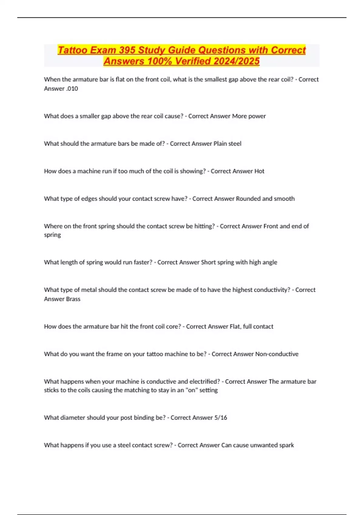 Tattoo Exam 395 Study Guide Questions with Correct Answers 100% Verified 2024/2025 When the armature bar is flat on the front coil, what is the smallest gap above the rear coil? - Correct Answer .010 What does a smaller gap above the rear coil cause? - Correct Answer More power What should the armature bars be made of? - Correct Answer Plain steel How does a machine run if too much of the coil is showing? - Correct Answer Hot What type of edges should your contact screw have? - Correct Answer Rounded and smooth Where on the front spring should the contact screw be hitting? - Correct Answer Front and end of spring What length of spring would run faster? - Correct Answer Short spring with high angle What type of metal should the contact screw be made of to have the highest conductivity? - Correct Answer Brass How does the armature bar hit the front coil core? - Correct Answer Flat, full contact What do you want the frame on your tattoo machine to be? - Correct Answer Non-conductive What happens when your machine is conductive and electrified? - Correct Answer The armature bar sticks to the coils causing the matching to stay in an "on" setting What diameter should your post binding be? - Correct Answer 5/16 What happens if you use a steel contact screw? - Correct Answer Can cause unwanted spark When setting up your machine, why would you "snug" down the eye of the needle bar? - Correct Answer This help