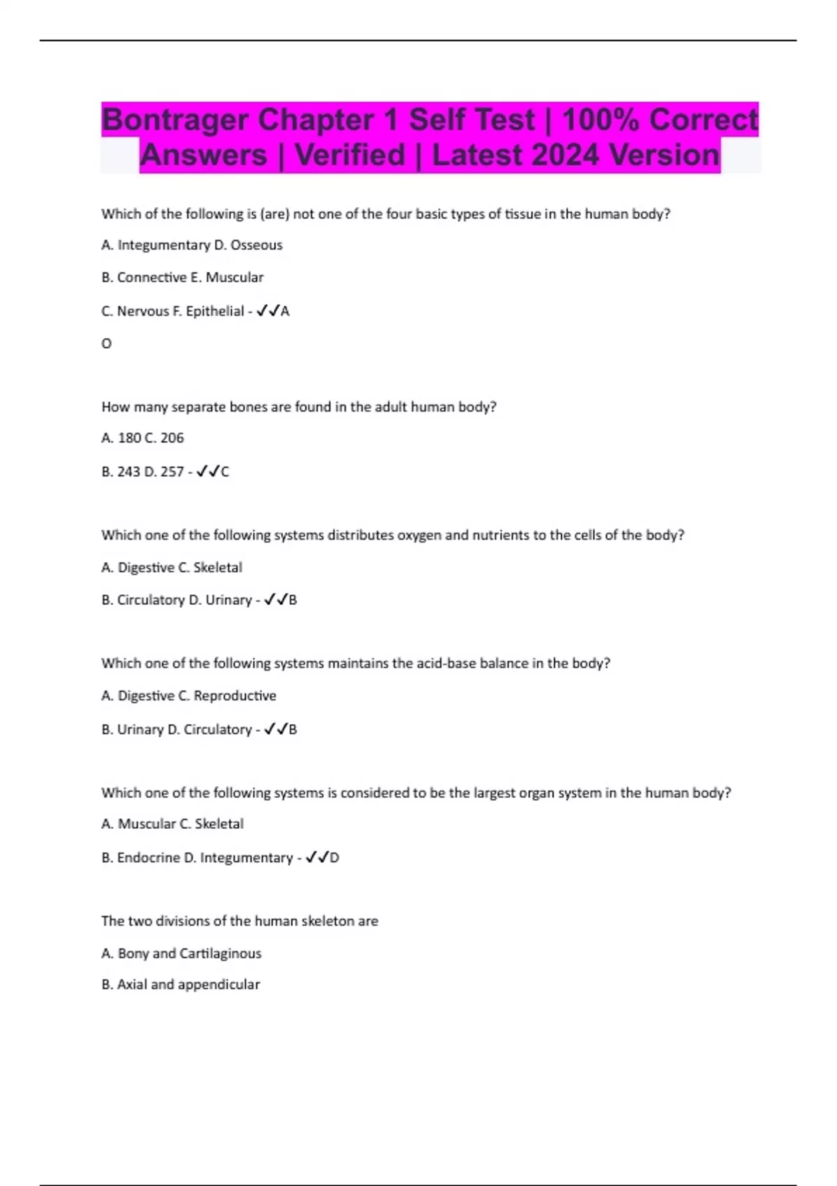 Which of the following is (are) not one of the four basic types of tissue in the human body? A. Integumentary D. Osseous B. Connective E. Muscular C. Nervous F. Epithelial - A O How many separate bones are found in the adult human body? A. 180 C. 206 B. 243 D. 257 - C Which one of the following systems distributes oxygen and nutrients to the cells of the body? A. Digestive C. Skeletal B. Circulatory D. Urinary - B Which one of the following systems maintains the acid-base balance in the body? A. Digestive C. Reproductive B. Urinary D. Circulatory - B Which one of the following systems is considered to be the largest organ system in the human body? A. Muscular C. Skeletal B. Endocrine D. Integumentary - D The two divisions of the human skeleton are A. Bony and Cartilaginous B. Axial and appendicularC. Vertebral and extremities D. integumentary and appendicular - B Which portion of the long bones is responsible for the production of the red blood cells? A. Spongy or cancellous B. Periosteum C. Hy