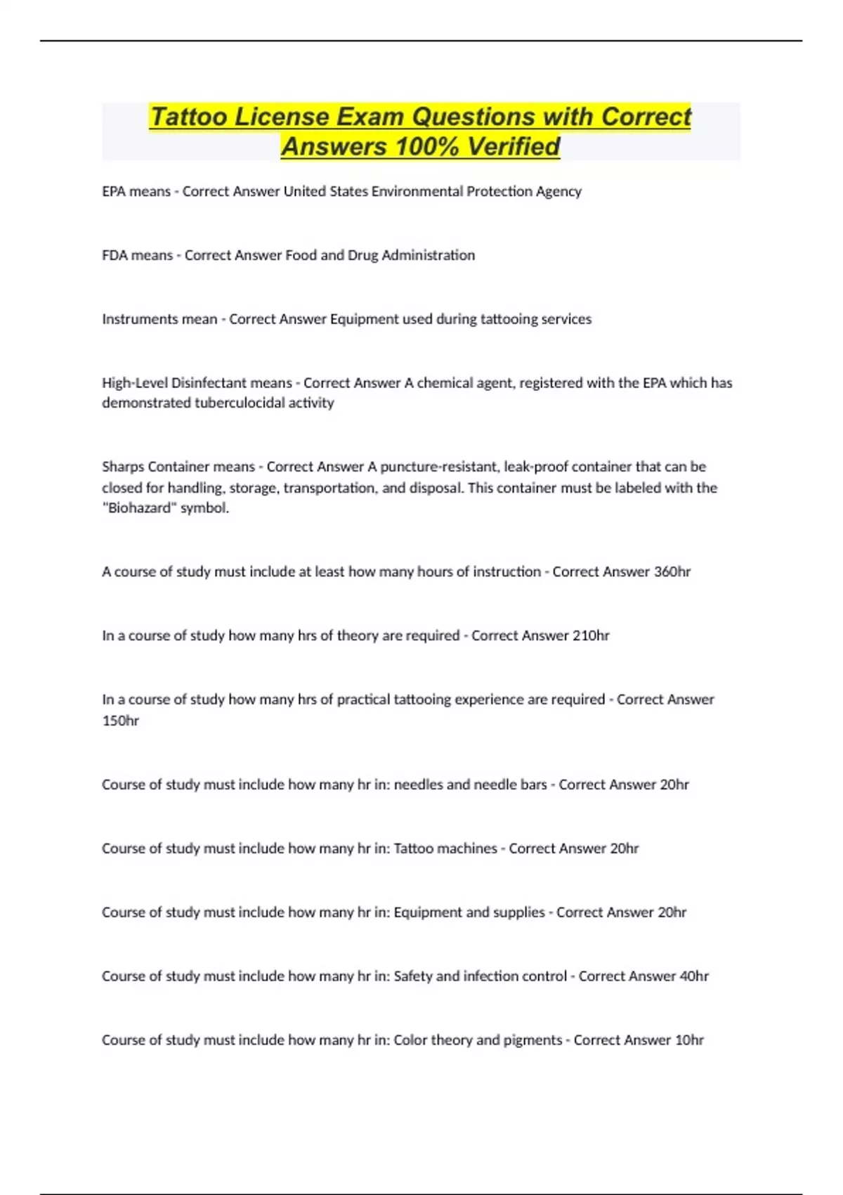 Tattoo License Exam Questions with Correct Answers 100% Verified EPA means - Correct Answer United States Environmental Protection Agency FDA means - Correct Answer Food and Drug Administration Instruments mean - Correct Answer Equipment used during tattooing services High-Level Disinfectant means - Correct Answer A chemical agent, registered with the EPA which has demonstrated tuberculocidal activity Sharps Container means - Correct Answer A puncture-resistant, leak-proof container that can be closed for handling, storage, transportation, and disposal. This container must be labeled with the "Biohazard" symbol. A course of study must include at least how many hours of instruction - Correct Answer 360hr In a course of study how many hrs of theory are required - Correct Answer 210hr In a course of study how many hrs of practical tattooing experience are required - Correct Answer 150hr Course of study must include how many hr in: needles and needle bars - Correct Answer 20hr Course of study must include how many hr in: Tattoo machines - Correct Answer 20hr Course of study must include how many hr in: Equipment and supplies - Correct Answer 20hr Course of study must include how many hr in: Safety and infection control - Correct Answer 40hr Course of study must include how many hr in: Color theory and pigments - Correct Answer 10hr