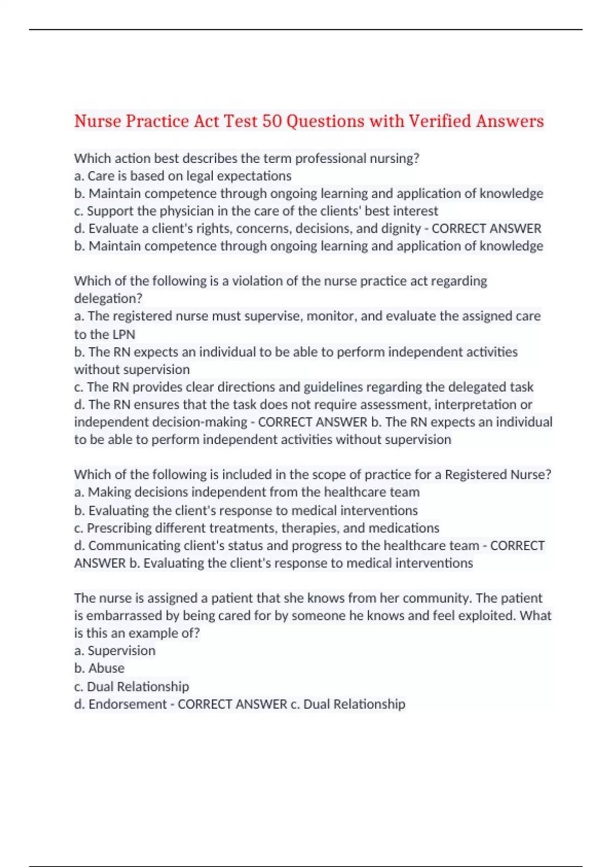 Nurse Practice Act Test 50 Questions with Verified Answers Which action best describes the term professional nursing? a. Care is based on legal expectations b. Maintain competence through ongoing learning and application of knowledge c. Support the physician in the care of the clients' best interest d. Evaluate a client's rights, concerns, decisions, and dignity - CORRECT ANSWER b. Maintain competence through ongoing learning and application of knowledge Which of the following is a violation of the nurse practice act regarding delegation? a. The registered nurse must supervise, monitor, and evaluate the assigned care to the LPN b. The RN expects an individual to be able to perform independent activities without supervision c. The RN provides clear directions and guidelines regarding the delegated task d. The RN ensures that the task does not require assessment, interpretation or independent decision-making - CORRECT ANSWER b. The RN expects an individual to be able to perform independent activities without supervision Which of the following is included in the scope of practice for a Registered Nurse? a. Making decisions independent from the healthcare team b. Evaluating the client's response to medical interventions c. Prescribing different treatments, therapies, and medications d. Communicating client's status and progress to the healthcare team - CORRECT ANSWER b. Evaluating the client's response to medical interventions The nurse is assigned a patient that she knows from her community. The patient is embarrassed by being cared for by someone he knows and feel exploited. What is this an example of? a. Supervision b. Abuse c. Dual Relationship d. Endorsement - CORRECT ANSWER c. Dual Relationship According to the professional practice standards, what can a RN delegate? a. Nursing based decisions to other members of the healthcare team b. A task that is within the scope of practice for that person c. Client assessments and coordination of clients plan of care d. Administration of a narcotic to a nursing assistant - CORRECT ANSWER c. Client assessments and coordination of clients plan of care Which action when delegated to a Certified Nurse Assistant (CNA) or Licensed Nursing Assistant (LNA) by a RN violates the nurse practice act? a. Obtaining and documenting vital signs b. Comprehensive nursing assessment and health care education c. Performing oral and denture care d. Ambulating and repositioning a dependent patient - CORRECT ANSWER b. Comprehensive nursing assessment and health care education Which of the following is included in the description of unprofessional conduct? a. Integrating patient values while providing patient care b. Taking 5 days to notify the board of a felony or misdemeanor charge c. Reporting a registered nurse whose work history includes unsafe and unprofessional behavior d. Permitting or allowing another person to use the nurse's license for any purpose - CORRECT ANSWER d. Permitting or allowing another person to use the nurse's license for any purpose Which of the following would be considered unprofessional conduct for a nurse? a. Failure to report another nurse with evidence of impairment while on duty b. Failure to obtain continuing education units c. Failure to obtain current insurance information from the client d. Failure to honor an agreement to work for a hospital after accepting a scholarship - CORRECT ANSWER a. Failure to report another nurse with evidence of impairment while on duty Which of the following does the Arizona State Board of Nursing have authority over? a. Nursing education programs leading to licensure or certification b. Nursing students and certified nursing assistant students c. All nurse externs in approved nursing programs d. Continuing education nursing programs - CORRECT ANSWER a. Nursing education programs leading to licensure or certification When should a nurse notify the board if they change his/her address? a. The last day of the birthday month of the licensee b. January 1st of the year of expiration c. Within 30 days of the address change d. April 1st of the year of expiration - CORRECT ANSWER c. Within 30 days of the address change Interpret when a person is able to practice as a registered nurse without an Arizona or compact license? a. When a nurse with a license is in good standing in any other US state or territory b. When a nurse is licensed in another state and employed by the federal government c. When a nurse is licensed in another state and still in orientation at a health care facility d. When a nurse is a new graduate of a board approved nursing program before taking the licensure exam (NCLEX) - CORRECT ANSWER b. When a nurse is licensed in another state and employed by the federal government In order to qualify for RN licensure in Arizona, what evidence is required of graduates of an international nursing programs? a. Passing NCLEX, graduating from a comparable nursing program, and demonstrating English language proficiency b. Licensure in another country, a valid visa screen document, and a social security number c. Passing NCLEX or an equivalent exam in their country and demonstrating English language proficiency d. Passing NCLEX, licensure in another country, and proof of legal residence in the US - CORRECT ANSWER a. Passing NCLEX, graduating from a comparable nursing program, and demonstrating English language proficiency How often is it required for a nursing license to be renewed in Arizona? a. 1 year b. 2 years c. 4 years d. 5 years - CORRECT ANSWER c. 4 years What might occur if the Board finds that a nurse has committed an act of unprofessional conduct and there is insufficient seriousness related to patient care to warrant disciplinary action? a. Issue a letter of concern b. Issue an administrative penalty c. Issue a decree of censure d. Recommend termination - CORRECT ANSWER a. Issue a letter of concern From which of the following does the board have the authority to issue an administrative penalty? a. 