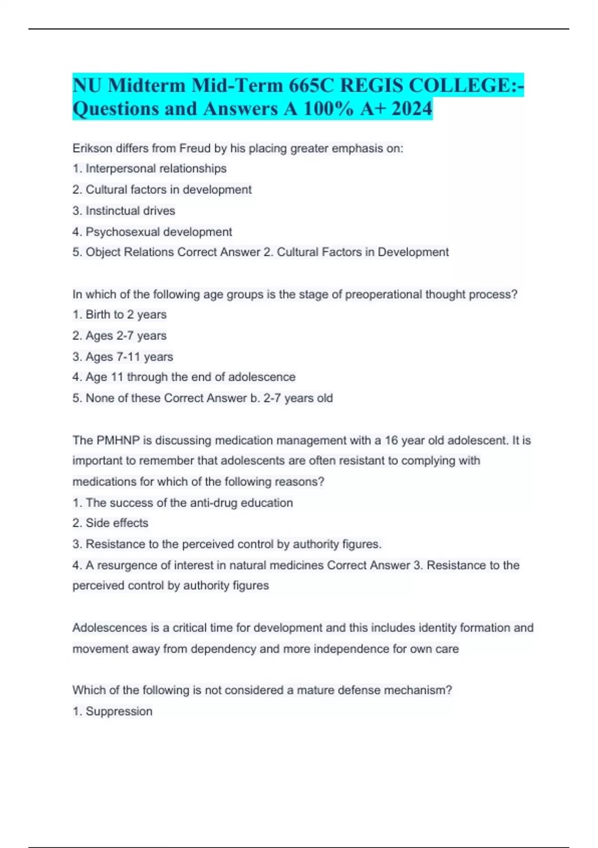 NU Midterm Mid-Term 665C REGIS COLLEGE:- Questions and Answers A 100% A+ 2024 Erikson differs from Freud by his placing greater emphasis on: 1. Interpersonal relationships 2. Cultural factors in development 3. Instinctual drives 4. Psychosexual development 5. Object Relations Correct Answer 2. Cultural Factors in Development In which of the following age groups is the stage of preoperational thought process? 1. Birth to 2 years 2. Ages 2-7 years 3. Ages 7-11 years 4. Age 11 through the end of adolescence 5. None of these Correct Answer b. 2-7 years old The PMHNP is discussing medication management with a 16 year old adolescent. It is important to remember that adolescents are often resistant to complying with medications for which of the following reasons? 1. The success of the anti-drug education 2. Side effects 3. Resistance to the perceived control by authority figures. 4. A resurgence of interest in natural medicines Correct Answer 3. Resistance to the perceived control by authority figures Adolescences is a critical time for development and this includes identity formation and movement away from dependency and more independence for own care Which of the following is not considered a mature defense mechanism? 1. Suppression 2. Somatization 3. Asceticism 4. Anticipation 5. Altruism Correct Answer 2. Somatization Who is the theorist generally credited with developing interpersonal therapy? 1. Melanie Klein 2. Harry Stack Sullivan 3. Marsha Linehan 4. Aaron Beck Correct Answer 2. Harry Stack Sullivan You are using a cognitive-behavioral approach to help a pediatric patient change self-defeating behaviors. Which of the following would you highlight when using a cognitive-behavioral approach? 1. Feelings 2. Beliefs 3. Introjection 4. Projection identification Correct Answer 2. Beliefs Which of the following methods is not used in biofeedback? 1. Strain gauge 2. Galvanic skin response 3. Electromyography 4. Electroencephalography 5. All of the above Correct Answer 1. Strain gauge Which of the following theorists is considered the founder of the attachment theory? 1. John Bowlby 2. Otto Kernberg 3. Melanie Klein 4. Heinz Kohut 5. Adolf Meyer Correct Answer 1. John Bowlby American psychologist Edward L Thorndike described 1. Drive reduction theory 2. Trial and error learning 3. Respondent behavior 4. Behaviorism 5. Operant behavior Correct Answer 2. Trial and error learning Attachment theory states that 1. Infants are generally polytropic in their attachments 2. Attachment disorders may lead to failure to thrive 3. Attachment occurs instantaneously between the mother and the child 4. Attachment is synonymous with bonding