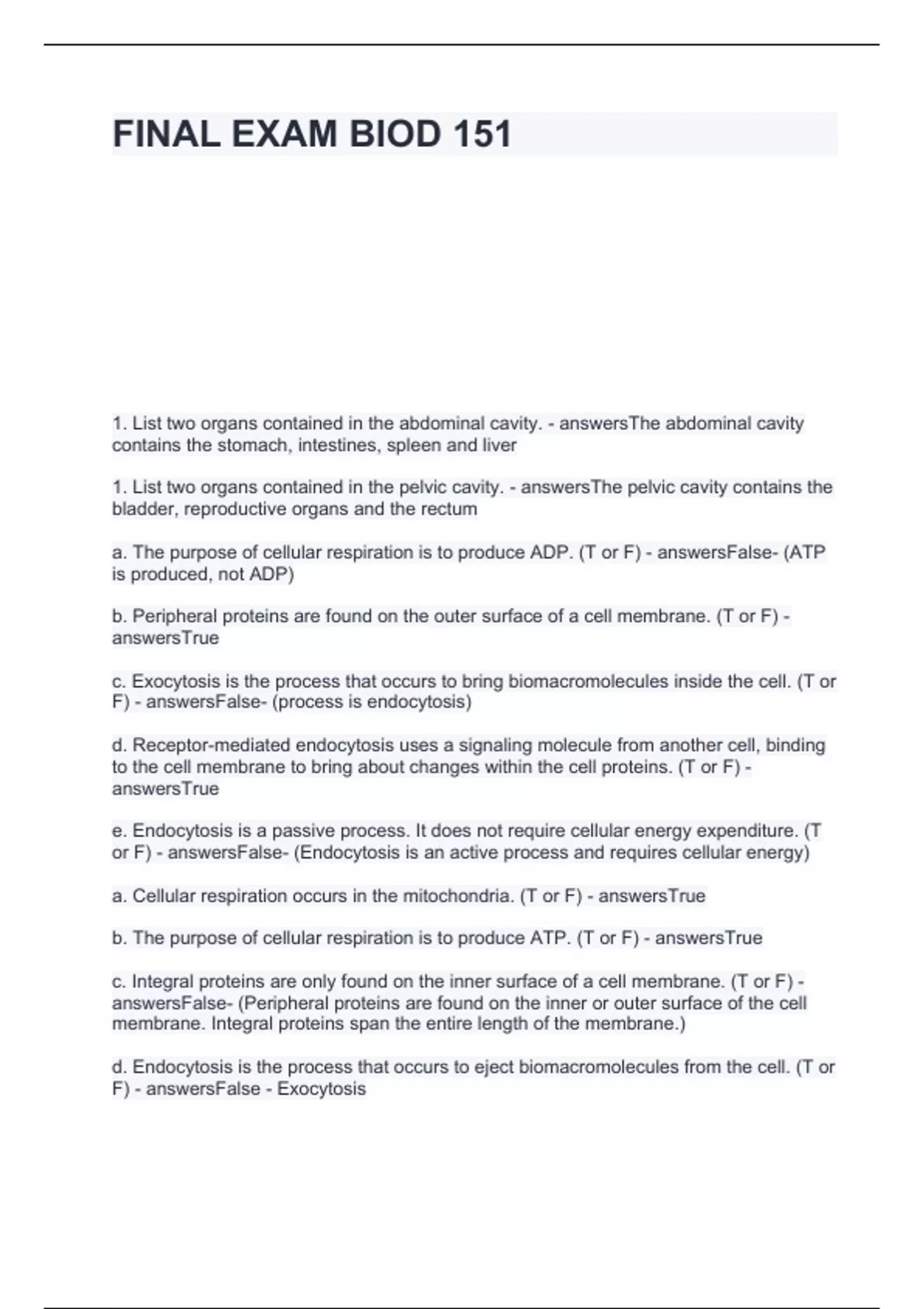 FINAL EXAM BIOD 151questions with correct answers