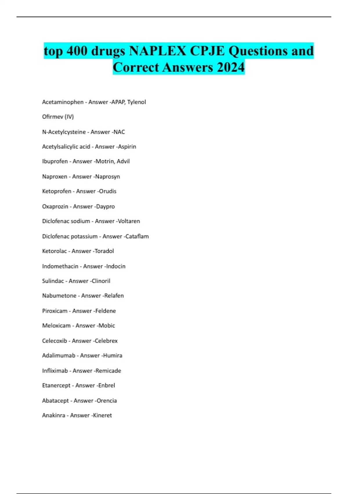 top 400 drugs NAPLEX CPJE Questions and Correct Answers 2024 Acetaminophen - Answer -APAP, Tylenol Ofirmev (IV) N-Acetylcysteine - Answer -NAC Acetylsalicylic acid - Answer -Aspirin Ibuprofen - Answer -Motrin, Advil Naproxen - Answer -Naprosyn Ketoprofen - Answer -Orudis Oxaprozin - Answer -Daypro Diclofenac sodium - Answer -Voltaren Diclofenac potassium - Answer -Cataflam Ketorolac - Answer -Toradol Indomethacin - Answer -Indocin Sulindac - Answer -Clinoril Nabumetone - Answer -Relafen Piroxicam - Answer -Feldene Meloxicam - Answer -Mobic Celecoxib - Answer -Celebrex Adalimumab - Answer -Humira Infliximab - Answer -Remicade Etanercept - Answer -Enbrel Abatacept - Answer -Orencia Anakinra - Answer -KineretLeflunomide - Answer -Arava Sulfasalazine - Answer -Azulfidine Methotrexate - Answer -Rheumatrex Hyroxychloroquine - Answer -Plaquenil Azathioprine - Answer -Imuran Penicillin VK - Answer -Veetids Dicloxacilin - Answer -D