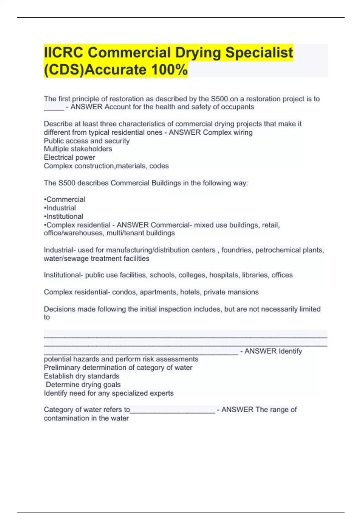 The first principle of restoration as described by the S500 on a restoration project is to _____ - ANSWER Account for the health and safety of occupants Describe at least three characteristics of commercial drying projects that make it different from typical residential ones - ANSWER Complex wiring Public access and security Multiple stakeholders Electrical power Complex construction,materials, codes The S500 describes Commercial Buildings in the following way: •Commercial •Industrial •Institutional •Complex residential - ANSWER Commercial- mixed use buildings, retail, office/warehouses, multi/tenant buildings Industrial- used for manufacturing/distribution centers , foundries, petrochemical plants, water/sewage treatment facilities Institutional- public use facilities, schools