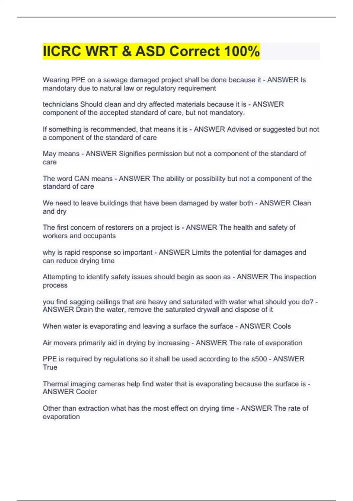 Wearing PPE on a sewage damaged project shall be done because it - ANSWER Is mandotary due to natural law or regulatory requirement technicians Should clean and dry affected materials because it is - ANSWER component of the accepted standard of care, but not mandatory. If something is recommended, that means it is - ANSWER Advised or suggested but not a component of the standard of care May means - ANSWER Signifies permission but not a component of the standard of care The word CAN means - ANSWER The ability or possibility but not a component of the standard of care We need to leave buildings that have been damaged by water both - ANSWER Clean and dry