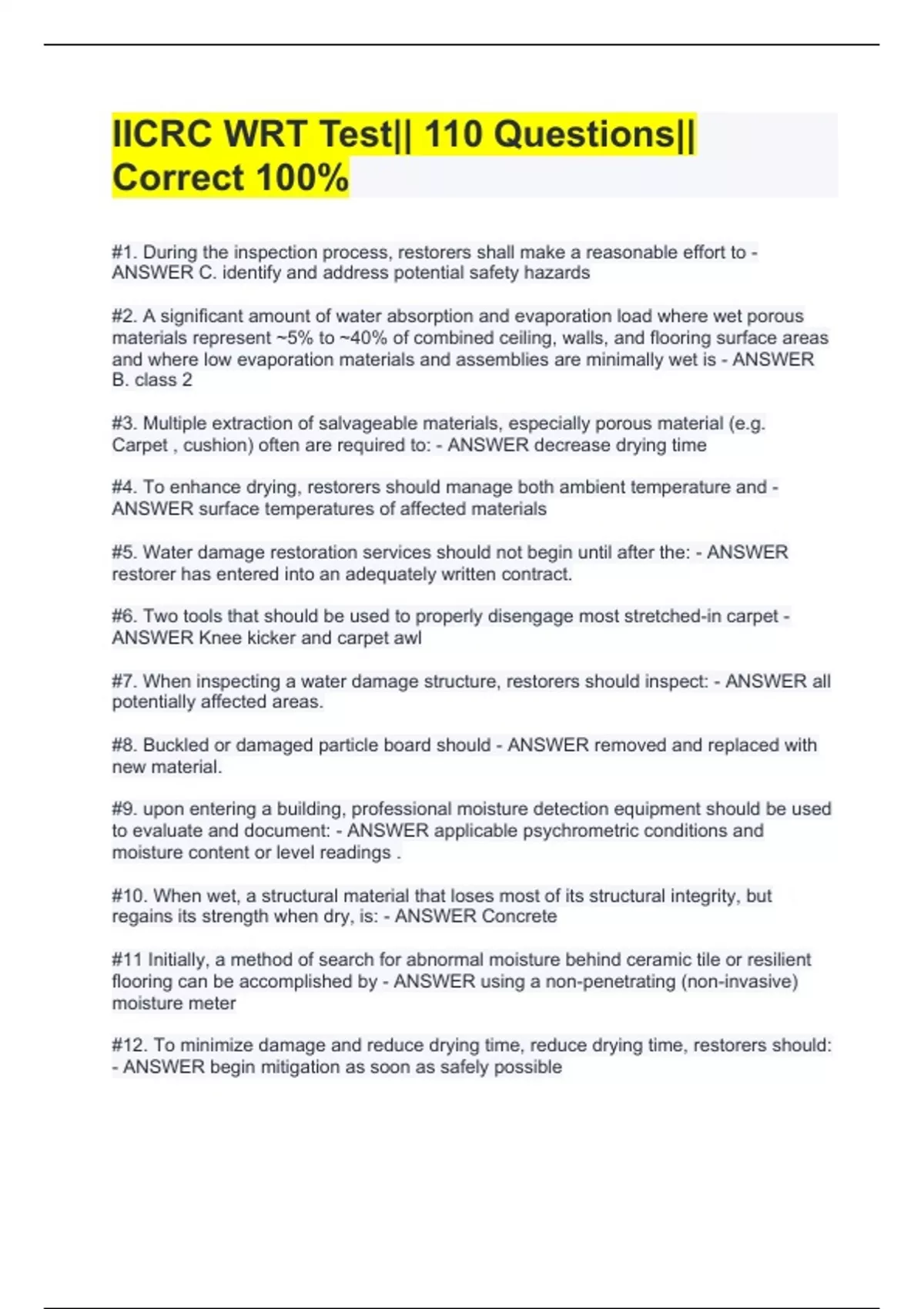 IICRC WRT Test|| 110 Questions|| Correct 100%