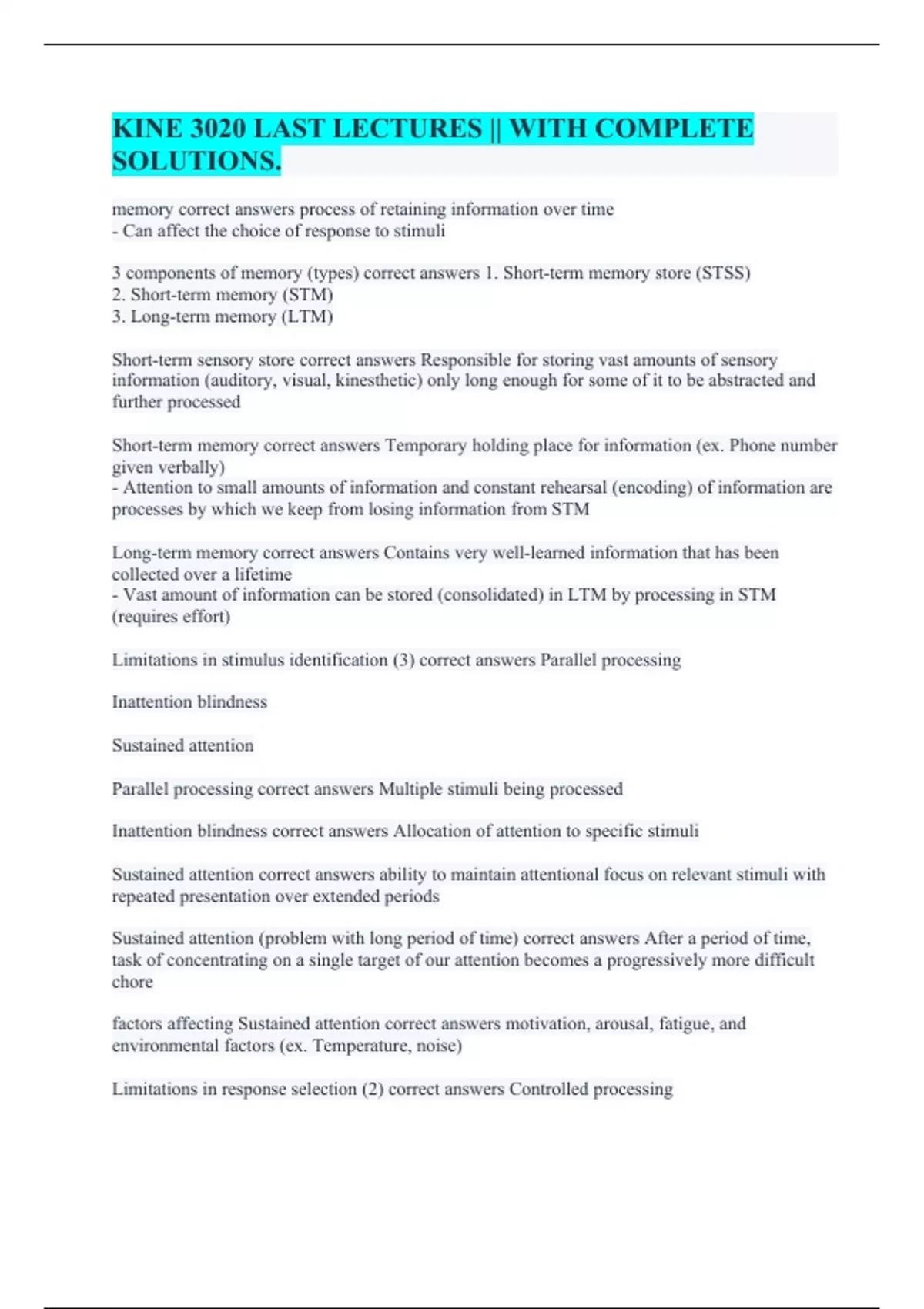 memory correct answers process of retaining information over time - Can affect the choice of response to stimuli 3 components of memory (types) correct answers 1. Short-term memory store (STSS) 2. Short-term memory (STM) 3. Long-term memory (LTM) Short-term sensory store correct answers Responsible for storing vast amounts of sensory information (auditory, visual, kinesthetic) only long enough for some of it to be abstracted and further processed Short-term memory correct answers Temporary holding place for information (ex. Phone number given verbally) - Attention to small amounts of information and constant rehearsal (encoding) of information are processes by which we keep from losing information from STM Long-term memory correct answers Contains very well-learned information that has been collected over a lifetime - Vast amount of information can be stored (consolidated) in LTM by processing in STM (requires effort) Limitations in stimulus identification (3) correct answers Parallel processing Inattention blindness Sustained attention Parallel processing correct answers Multiple stimuli being processed Inattention blindness correct answers Allocation of attention to specific stimuli Sustained attention correct answers ability to maintain attentional focus on relevant stimuli with repeated presentation over extended periods Sustained attention (problem with long period of time) correct answers After a period of time, task of concentrating on a single target of our attention becomes a progressively more difficult chore factors affecting Sustained attention correct answers motivation, arousal, fatigue, and environmental factors (ex. Temperature, noise) Limitations in response selection (2) correct answers Controlled processing