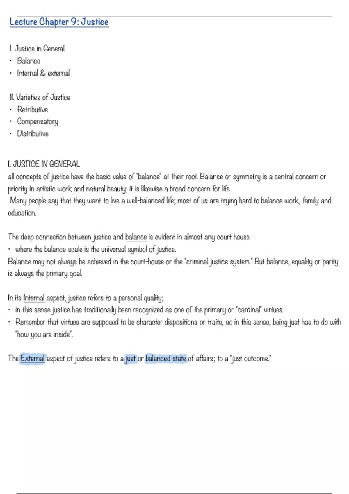 Justice in General - balance - internal & external Varieties of Justice - Retributive - compensatory - distributive