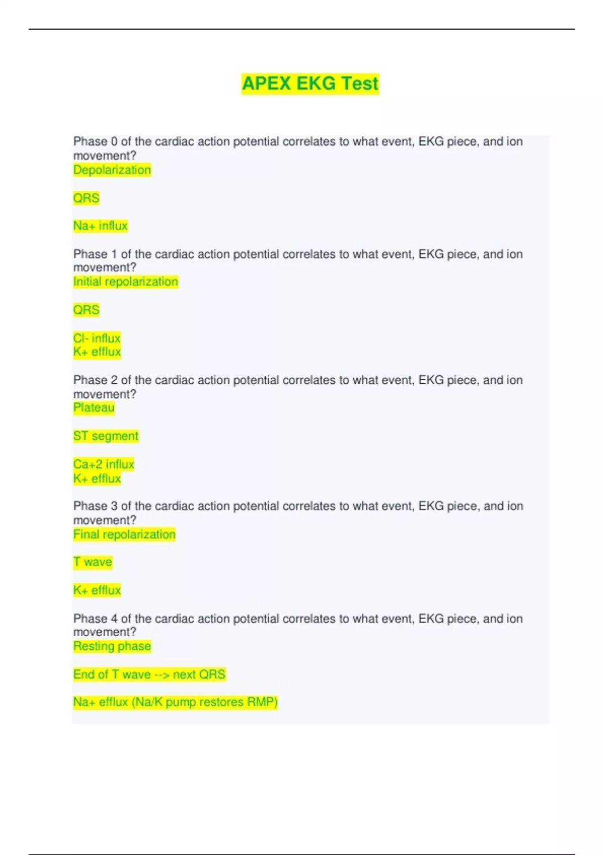APEX EKG Test - Questions and Answers (Complete Solutions) Phase 0 of the cardiac action potential correlates to what event, EKG piece, and ion movement? Depolarization QRS Na+ influx Phase 1 of the cardiac action potential correlates to what event, EKG piece, and ion movement? Initial repolarization QRS Cl- influx K+ efflux Phase 2 of the cardiac action potential correlates to what event, EKG piece, and ion movement? Plateau ST segment Ca+2 influx K+ efflux Phase 3 of the cardiac action potential correlates to what event, EKG piece, and ion movement? Final repolarization T wave K+ efflux Phase 4 of the cardiac action potential correlates to what event, EKG piece, and ion movement? Resting phase End of T wave --> next QRS Na+ efflux (Na/K pump restores RMP) What are the Bipolar leads? I, II, III What are the limb leads? aVR, aVL, aVF What are the precordial leads? V1, V2, V3, V4, V5, V6 What are the 3 internodal tracts that connect the SA to the AV node? Anterior = Bachmann bundle Middle = Wenckebach Posterior = Thorel P wave Duration 0.08 - 0.12 sec PR interval Duration 0.12 - 0.20 seconds What condition can prolong the PR interval? Pericarditis Q wave Duration < 0.04 seconds What 3 variations of the Q wave could be indicative of an MI? amplitude > 1/3 of R wave duration > 0.04 seconds depth > 1mm QRS complex Duration < 0.10 seconds What 5 conditions could cause wide QRS? LVH BBB ectopic beat WPW Hyperkalemia QT interval Duration < 0.45 men < 0.47 women What electrolyte disturbances can cause a short QT? Hyperkalemia Hypercalcemia What electrolyte distrubances can cause a long QT? Hypokalemia Hypocalcemia The T wave usually points in the same direction as the QRS. If the T wave points opposite of QRS under what 2 circumstances? Myocardial ischemia BBB Consider an MI if the ST segment shows elevation or depression > ______mm 1mm Peaked T waves can be caused by what 3 conditions? myocardial ischemia hyperkalemia intracranial bleed A U wave, which is usually absent, may be a sign of what electrolyte disturbance? hypokalemia (if > 1.5mm) Where do you measure ST changes?