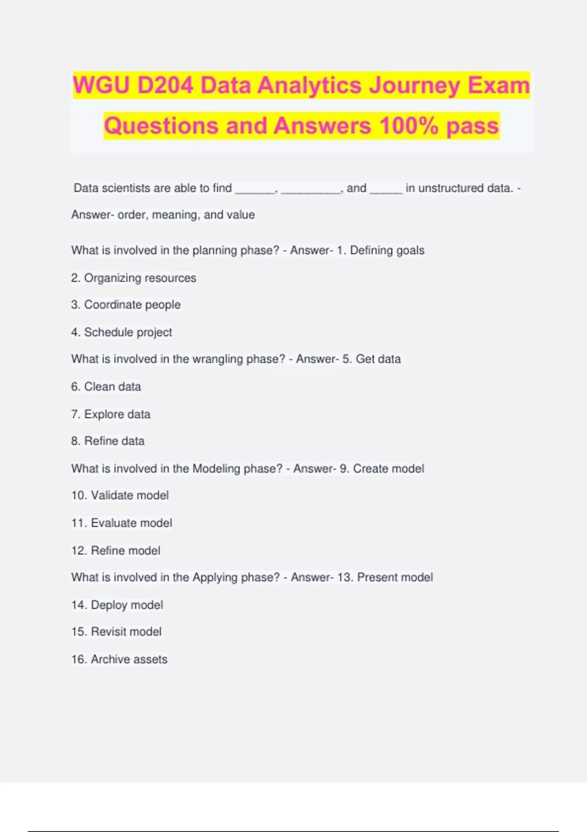 WGU D204 Data Analytics Journey Exam Questions and Answers 100% pass Data scientists are able to find ______, _________, and _____ in unstructured data. - Answer- order, meaning, and value What is involved in the planning phase? - Answer- 1. Defining goals 2. Organizing resources 3. Coordinate people 4. Schedule project What is involved in the wrangling phase? - Answer- 5. Get data 6. Clean data 7. Explore data 8. Refine data What is involved in the Modeling phase? - Answer- 9. Create model 10. Validate model 11. Evaluate model 12. Refine model What is involved in the Applying phase? - Answer- 13. Present model 14. Deploy model 15. Revisit model 16. Archive assets ____________________ are programming languages that are very frequently used for data manipulation and modeling. - Answer- Python or R ___________ are general-purpose languages that are used for the back end, the foundational elementsterm-26 of data science, and they provide maximum speed. - Answer- C, and C++, and Java ____________________ is a language for working with relational databases to do queries and data manipulation. - Answer- SQL What does SQL stand for? - Answer- structured query language This is where you actually create the statistical model and you do the linear regression. You do the decision tree. You do the deep learning neural network. - Answer- Modeling These are the developers, and the system architects, the people who focus on the hardware and the software that make data science possible - Answer- Data engineers This is the phase of collecting data. - Answer- Data acquisition Which phase? - Working with stakeholders to help them ask better questions so that both they and you understand the outcome. - Answer- Discovery What are the 4 parts of data analytics cycle? - Answer- Planning, Wrangling, Modeling and Applying This phase is also known as the discovery phase. During this phase, an analyst defines the major questions of interest that need to be answered, understand the needs of the stakeholders, and assess the resource constraints in the project. - Answer- Business understanding ____________________ is the person who champions the vision of the project and has the authority to allocate resources. - Answer- The project sponsor