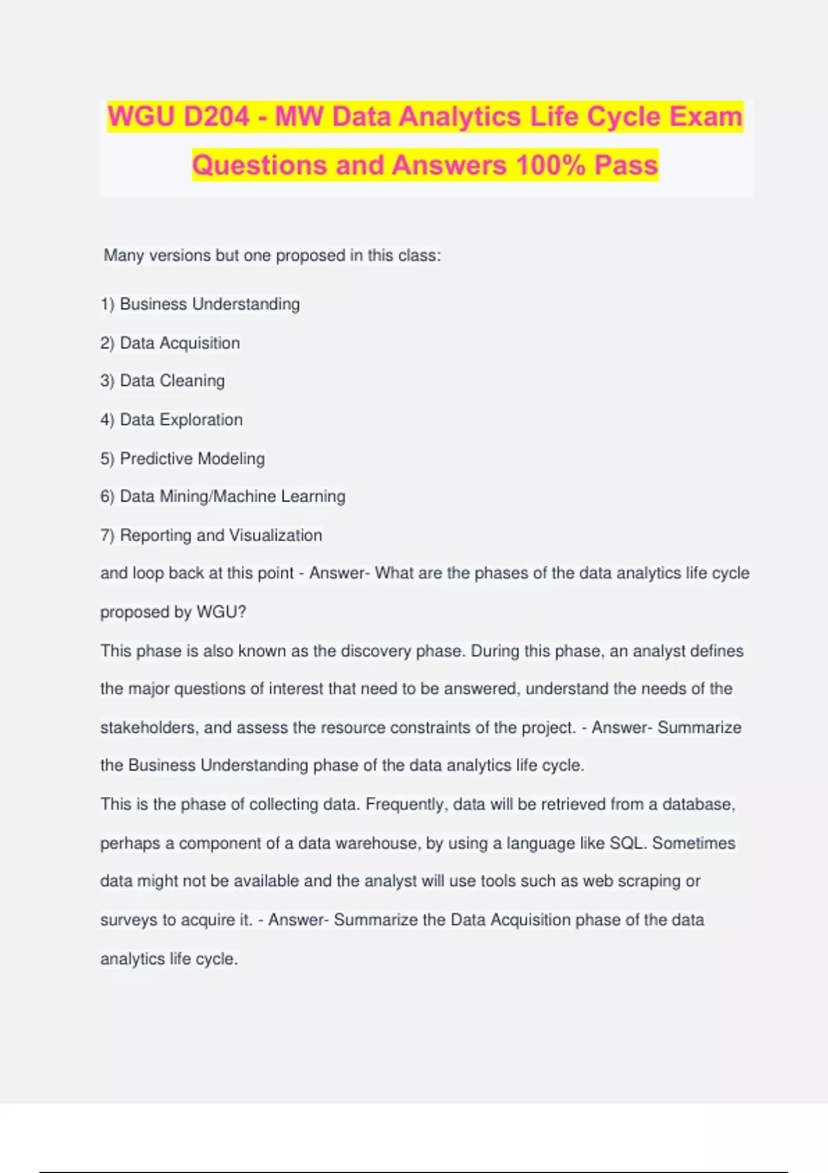 WGU D204 - MW Data Analytics Life Cycle Exam Questions and Answers 100% Pass Many versions but one proposed in this class: 1) Business Understanding 2) Data Acquisition 3) Data Cleaning 4) Data Exploration 5) Predictive Modeling 6) Data Mining/Machine Learning 7) Reporting and Visualization and loop back at this point - Answer- What are the phases of the data analytics life cycle proposed by WGU? This phase is also known as the discovery phase. During this phase, an analyst defines the major questions of interest that need to be answered, understand the needs of the stakeholders, and assess the resource constraints of the project. - Answer- Summarize the Business Understanding phase of the data analytics life cycle. This is the phase of collecting data. Frequently, data will be retrieved from a database, perhaps a component of a data warehouse, by using a language like SQL. Sometimes data might not be available and the analyst will use tools such as web scraping or surveys to acquire it. - Answer- Summarize the Data Acquisition phase of the data analytics life cycle. This phase is referred to by a variety of names. Common alternative terms include data cleansing, data wrangling, data munging, and feature engineering. When this phase is ignored or skipped, the results from the analysis may become irrelevant. There is no one common tool supporting this phase. An analyst will use SQL, Python, R, or Excel to perform various data modifications and transformations. - Answer- Summarize the Data Cleaning phase of the data analytics life cycle. In this phase, the analyst begins to understand the basic nature of data and the relationships within it. This phase often relies on the use of data visualization tools and numerical summaries, such as measures of central tendency and variability. - Answer- Summarize the Data Exploration phase of the data analytics life cycle. These tools enable an analyst to move beyond describing the data to creating models that enable predicting outcomes of interest. Tools such as Python and R play an important role in automating the training and using of models. - Answer- Summarize the Predictive Modeling phase of the data analytics life cycle. These tools became popular with the ability of computers to look for patterns in large amounts of data. In the industry, you will sometimes find terms like machine learning used in place of data mining. Tools such as Python and R play an important role in this stage. - Answer- Summarize the Data Mining/Machine Learning phase of the data analytics life cycle. In this phase, an analyst tells the story of the data and uses graphs or interactive dashboards to inform others of the findings from the analyses. Interactive dashboard tools, such as Tableau, allow even the novice user the ability to interact with the data and spot trends and patterns. - Answer- Summarize the Reporting and Visualization phase of the data analytics life cycle. This is another way to show the data analytics life cycle. It includes the following steps: 1) Planning 2) Wrangling 3) Modeling 4) Applying - Answer- What is the Data Science Pathway? 1. Define the goals 2. Organize resources 3. Coordinate people 4. Schedule project - Answer- Summarize the Planning phase of the Data Science Pathway. 5. Get data 6. Clean data 7. Explore data 8. Refine data - Answer- Summarize the Wrangling phase of the Data Science Pathway. 9. Create model 10. Validate model 11. Evaluate model 12. Refine model - Answer- Summarize the Modeling phase of the Data Science Pathway. 13. Present model 14. Deploy model 15. Revisit model 16. Archive assets - Answer- Summarize the Applying phase of the Data Science Pathway. Lives in the planning phase. Determine what you want to know. Helps keep you on target. Helps in every step of the Data Science Pathway. - Answer- Describe "Define the goals" from the Data Science Pathway. Lives in the planning phase. Identify what you will need for the project from computers, software, people, and time available. - Answer- Describe "Organize resources" from the Data Science Pathway. Lives in the planning phase. Projects are a team effort. Important to layout the flow of the project so people know when they will be needed. - Answer- Describe "Coordinate people" from the Data Science Pathway. Lives in the planning phase. Use time boxing by task to avoid project time exploding into too much time. - Answer- Describe "Schedule project" from the Data Science Pathway. Lives in the wrangling phase. Secure the data from