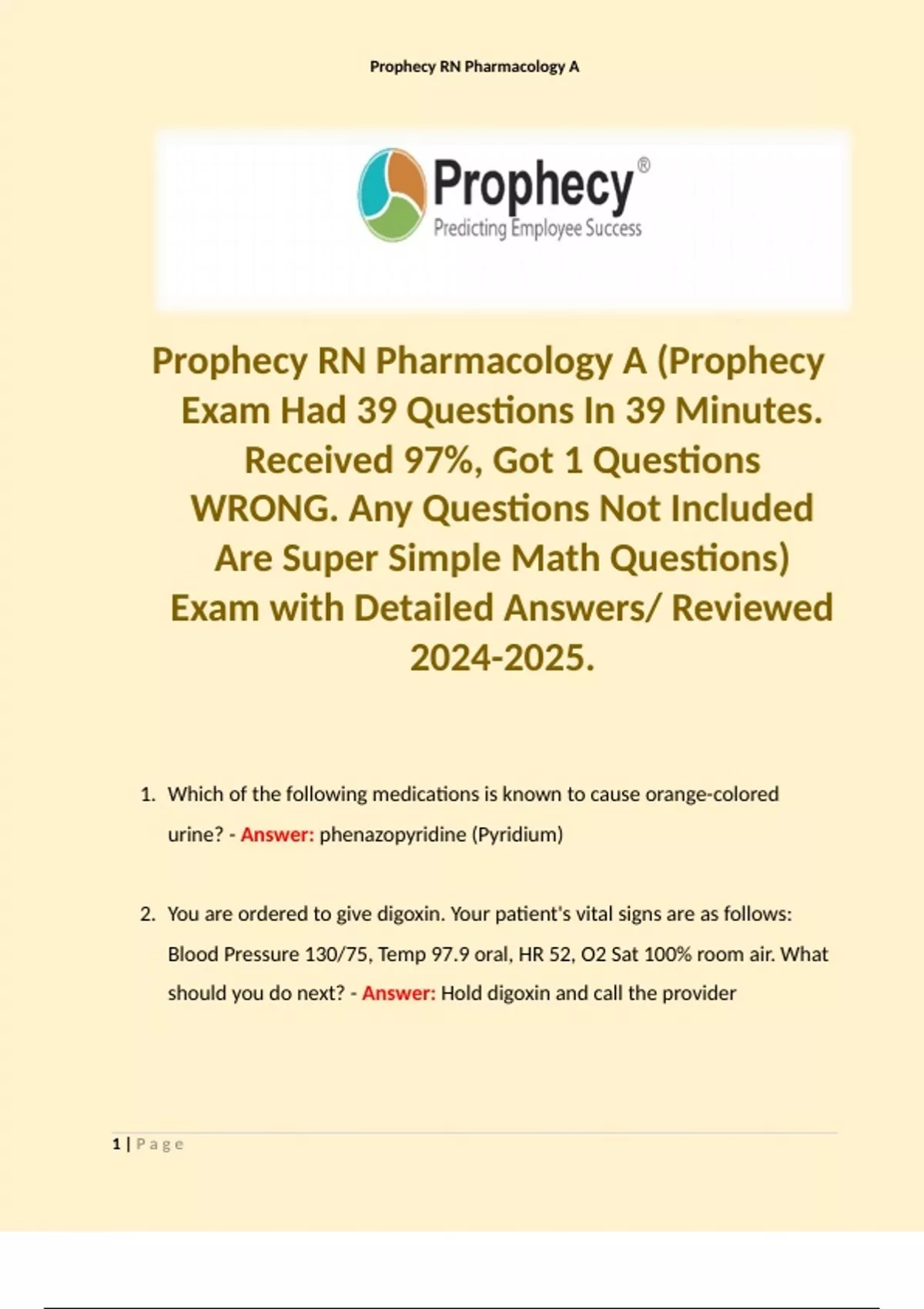 Prophecy RN Pharmacology A (Prophecy Exam Had 39 Questions In 39 Minutes. Received 97%, Got 1 Questions WRONG. Any Questions Not Included Are Super Simple Math Questions) Exam with Detailed Answers/ Reviewed .