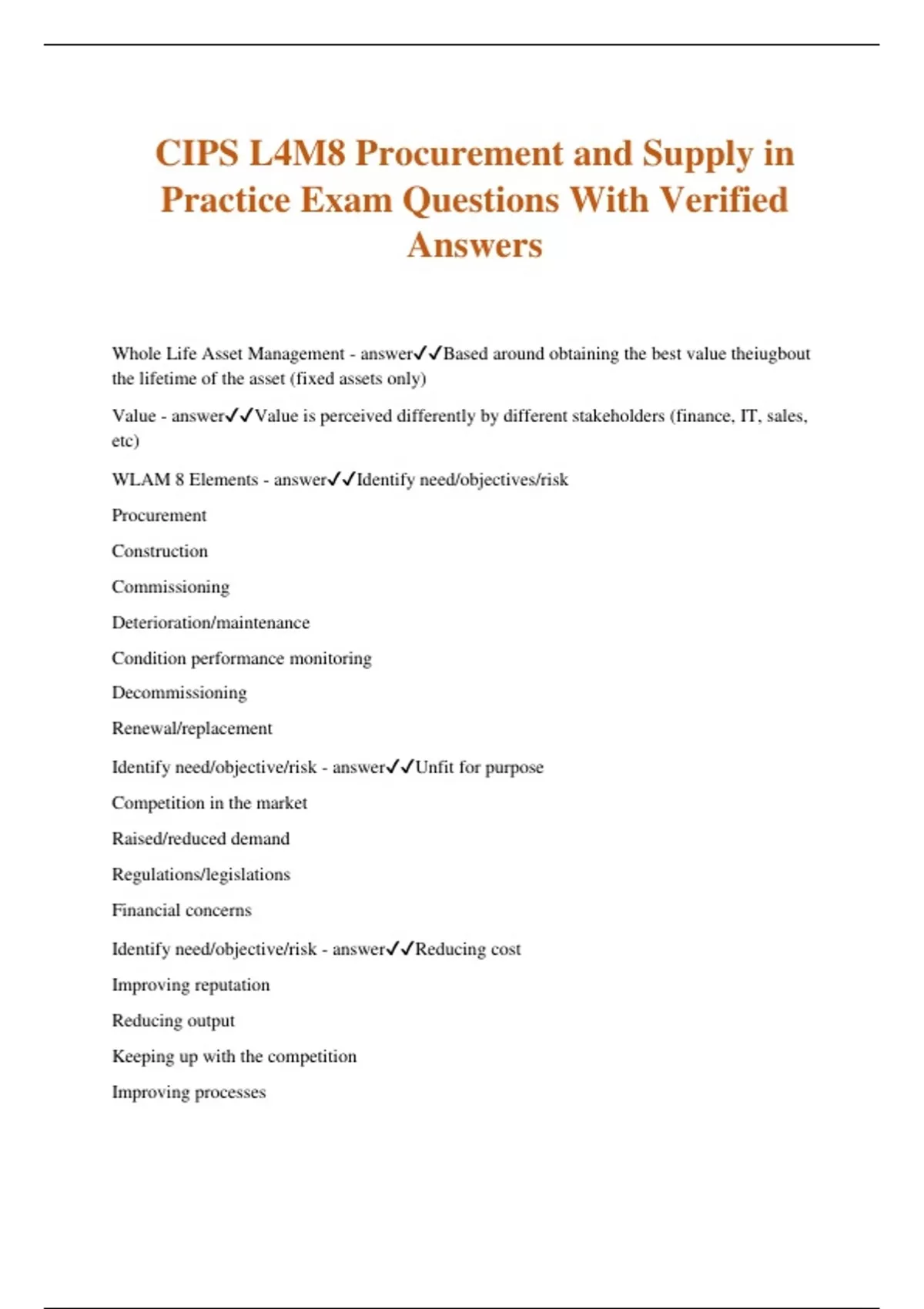 CIPS L4M8 Procurement and Supply in Practice Exam Questions With Verified Answers Whole Life Asset Management - answerBased around obtaining the best value theiugbout the lifetime of the asset (fixed assets only) Value - answerValue is perceived differently by different stakeholders (finance, IT, sales, etc) WLAM 8 Elements - answerIdentify need/objectives/risk Procurement Construction Commissioning Deterioration/maintenance Condition performance monitoring Decommissioning Renewal/replacement Identify need/objective/risk - answerUnfit for purpose Competition in the market Raised/reduced demand Regulations/legislations Financial concerns Identify need/objective/risk - answerReducing cost Improving reputation Reducing output Keeping up with the competition Improving processes Identify need/objective/risk - answerDowntime Resistance Incompatibility Associated costs Lost sales/revenue Procurement - answerIdentifying, selecting and evaluating potential suppliers then conducting the RFQ or ITT Construction - answerDesigning and manufacturing the asset Commissioning - answerBringing something new into working condition Commissioning Costs - answerInstallation Training Insurance Testing Operational efficiencies/performance Quality 5 Approaches to condition performance monitoring - answerDo nothing Reactive Preventative Redictive Proactive Extended Supply Chain - answerPrim
