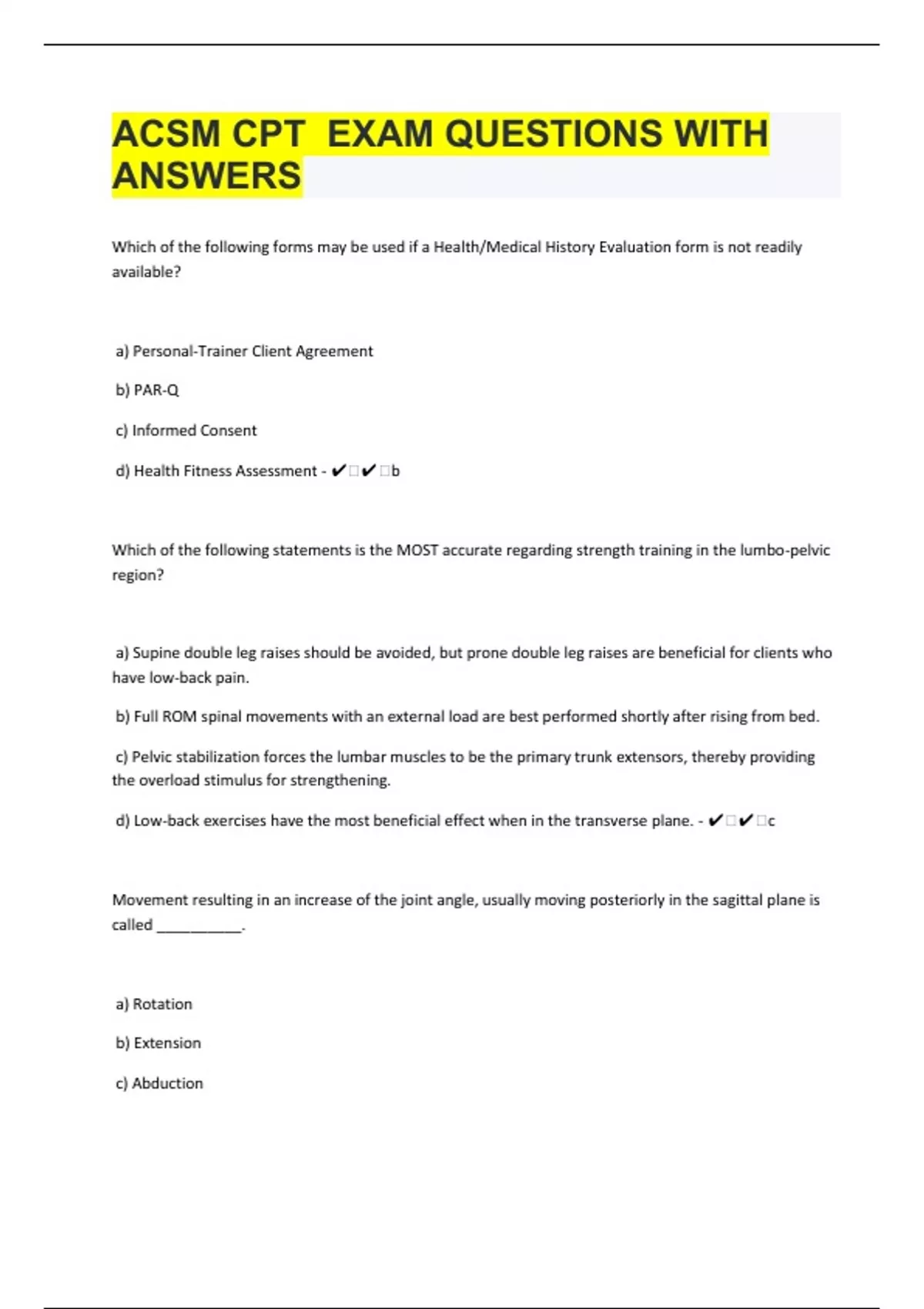 Which of the following forms may be used if a Health/Medical History Evaluation form is not readily available? a) Personal-Trainer Client Agreement b) PAR-Q c) Informed Consent d) Health Fitness Assessment - ️️b Which of the following statements is the MOST accurate regarding strength training in the lumbo-pelvic region? a) Supine double leg raises should be avoided, but prone double leg raises are beneficial for clients who have low-back pain. b) Full ROM spinal movements with an external load are best performed shortly after rising from bed. c) Pelvic stabilization forces the lumbar muscles to be the primary trunk extensors, thereby providing the overload stimulus for strengthening. d) Low-back exercises have the most beneficial effect when in the transverse plane. - ️️c Movement resulting in an increase of the joint angle, usually moving posteriorly in the sagittal plane is called __________. a) Rotation b) Extension c) Abduction d) Flexion - ️️b