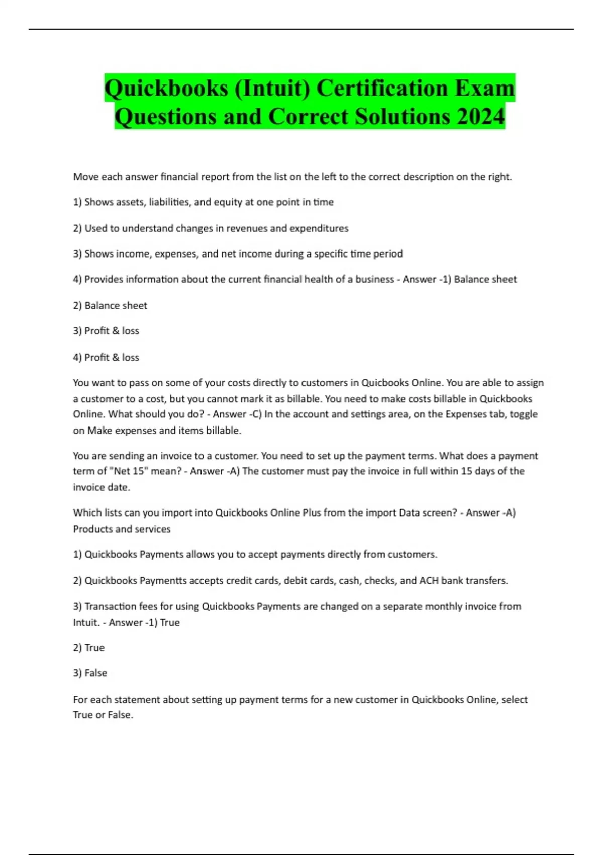 Quickbooks (Intuit) Certification Exam Questions and Correct Solutions 2024 Move each answer financial report from the list on the left to the correct description on the right. 1) Shows assets, liabilities, and equity at one point in time 2) Used to understand changes in revenues and expenditures 3) Shows income, expenses, and net income during a specific time period 4) Provides information about the current financial health of a business - Answer -1) Balance sheet 2) Balance sheet 3) Profit & loss 4) Profit & loss You want to pass on some of your costs directly to customers in Quicbooks Online. You are able to assign a customer to a cost, but you cannot mark it as billable. You need to make costs billable in Quickbooks Online. What should you do? - Answer -C) In the account and settings area, on the Expenses tab, toggle on Make expenses and items billable. You are sending an invoice to a customer. You need to set up the payment terms. What does a payment term of "Net 15" mean? - Answer -A) The customer must pay the invoice in full within 15 days of the invoice date. Which lists can you import into Quickbooks Online Plus from the import Data screen? - Answer -A) Products and services 1) Quickbooks Payments allows you to accept payments directly f