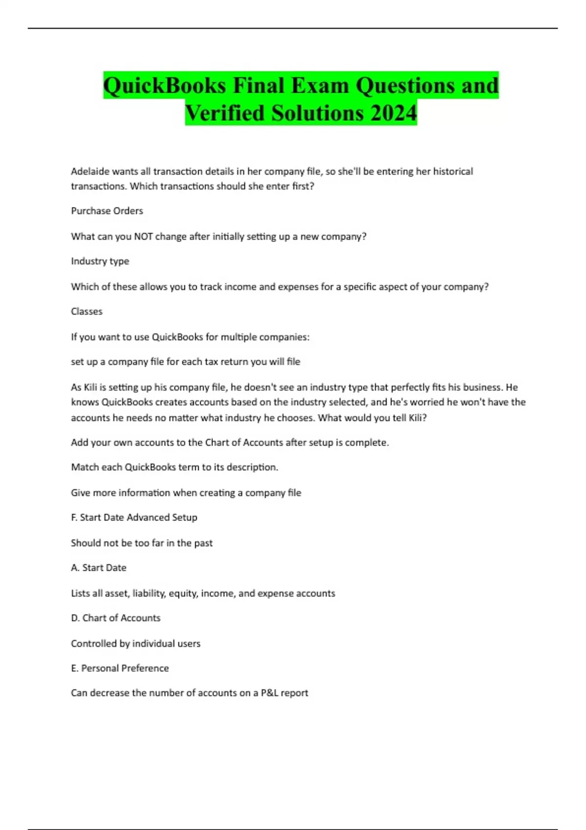 QuickBooks Final Exam Questions and Verified Solutions 2024 Adelaide wants all transaction details in her company file, so she'll be entering her historical transactions. Which transactions should she enter first? Purchase Orders What can you NOT change after initially setting up a new company? Industry type Which of these allows you to track income and expenses for a specific aspect of your company? Classes If you want to use QuickBooks for multiple companies: set up a company file for each tax return you will file As Kili is setting up his company file, he doesn't see an industry type that perfectly fits his business. He knows QuickBooks creates accounts based on the industry selected, and he's worried he won't have the accounts he needs no matter what industry he chooses. What would you tell Kili? Add your own accounts to the Chart of Accounts after setup is complete. Match each QuickBooks term to its description. Give more information when creating a company file F. Start Date Advanced Setup Should not be too far in the past A. Start Date Lists all asset, liability, equity, income, and expense accounts D. Chart of Accounts Controlled by individual users E. Personal Preference Can decrease the number of accounts on a P&L report