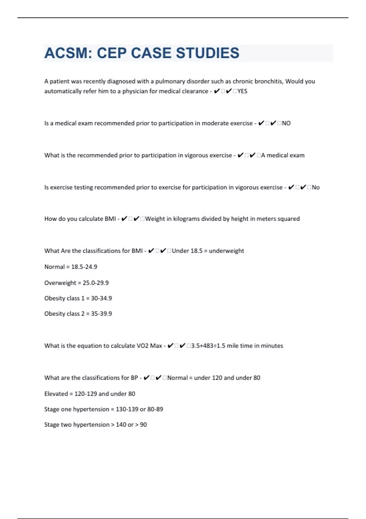 A patient was recently diagnosed with a pulmonary disorder such as chronic bronchitis, Would you automatically refer him to a physician for medical clearance - ️️YES Is a medical exam recommended prior to participation in moderate exercise - ️️NO What is the recommended prior to participation in vigorous exercise - ️️A medical exam Is exercise testing recommended prior to exercise for participation in vigorous exercise - ️️No How do you calculate BMI - ️️Weight in kilograms divided by height in meters squared What Are the classifications for BMI - ️️Under 18.5 = underweight Normal = 18.5-24.9 Overweight = 25.0-29.9 Obesity class 1 = 30-34.9 Obesity class 2 = 35-39.9 What is the equation to calculate VO2 Max - ️️3.5+483÷1.5 mile time in minutes What are the classifications for BP - ️️Normal = under 120 and under 80 Elevated = 120-129 and under 80 Stage one hypertension = 130-139 or 80-89 Stage two hypertension > 140 or > 90