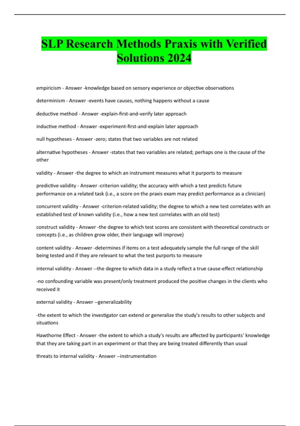 SLP Research Methods Praxis with Verified Solutions 2024 empiricism - Answer -knowledge based on sensory experience or objective observations determinism - Answer -events have causes, nothing happens without a cause deductive method - Answer -explain-first-and-verify later approach inductive method - Answer -experiment-first-and-explain later approach null hypotheses - Answer -zero; states that two variables are not related alternative hypotheses - Answer -states that two variables are related; perhaps one is the cause of the other validity - Answer -the degree to which an instrument measures what it purports to measure predictive validity - Answer -criterion validity; the accuracy with which a test predicts future performance on a related task (i.e., a score on the praxis exam may predict performance as a clinician) concurrent validity - Answer -criterion-related validity; the degree to which a new test correlates with an established test of known validity (i.e., how a new test correlates with an old test) construct validity - Answer -the degree to which test scores are consistent with theoretical constructs or concepts (i.e., as children grow older, their language will improve) content validity - Answer -determines if items on a test adequately sample the full range of the skill being tested and if they are relevant to what the test purports to measure internal validity - Answer --the degree to which data in a study reflect a true cause-effect relationship -no confounding variable was present/only treatment produced the positive changes in the clients who received it external validity - Answer --generalizability -the extent to which the investigator can extend or generalize the study's results to other subjects and situations Hawthorne Effect - Answer -the extent to which a study's results are affected by participants' knowle
