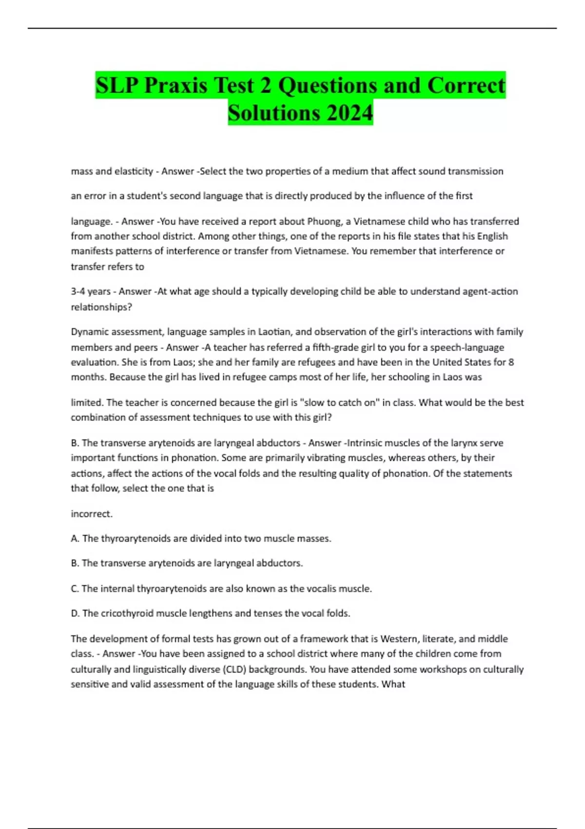 SLP Praxis Test 2 Questions and Correct Solutions 2024 mass and elasticity - Answer -Select the two properties of a medium that affect sound transmission an error in a student's second language that is directly produced by the influence of the first language. - Answer -You have received a report about Phuong, a Vietnamese child who has transferred from another school district. Among other things, one of the reports in his file states that his English manifests patterns of interference or transfer from Vietnamese. You remember that interference or transfer refers to 3-4 years - Answer -At what age should a typically developing child be able to understand agent-action relationships? Dynamic assessment, language samples in Laotian, and observation of the girl's interactions with family members and peers - Answer -A teacher has referred a fifth-grade girl to you for a speech-language evaluation. She is from Laos; she and her family are refugees and have been in the United States for 8 months. Because the girl has lived in refugee camps most of her life, her schooling in Laos was limited. The teacher is concerned because the girl is "slow to catch on" in class. What would be the best combination of assessment techniques to use with this girl? B. The transverse arytenoids are laryngeal abductors - Answer -Intrinsic muscles of the larynx serve important functions in phonation. Some are primarily vibrating muscles, whereas others, by their actions, affect the actions of the vocal folds and the resulting quality of phonation. Of the statements that follow, select the one that is incorrect. A. The thyroarytenoids are divided into two muscle masses. B. The transverse arytenoids are laryngeal abductors. C. The internal thyroarytenoids are also known as the vocalis muscle. D. The cricothyroid muscle lengthens and tenses the vocal folds. The development of formal tests has grown out of a framework that is Western, literate, and middle class. - Answer -You have been assigned to a school district where many of the children come from culturally and linguistically diverse (CLD) backgrounds. You have attended some workshops on culturally sensitive and valid assessment of the language skills of these stud