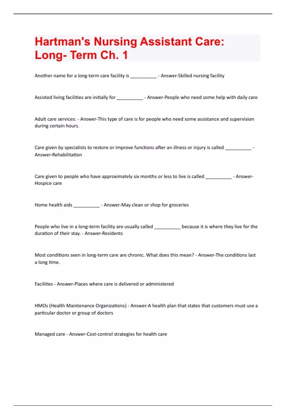 Hartman's Nursing Assistant Care: Long- Term Ch. 1 questions and answers all are graded A+