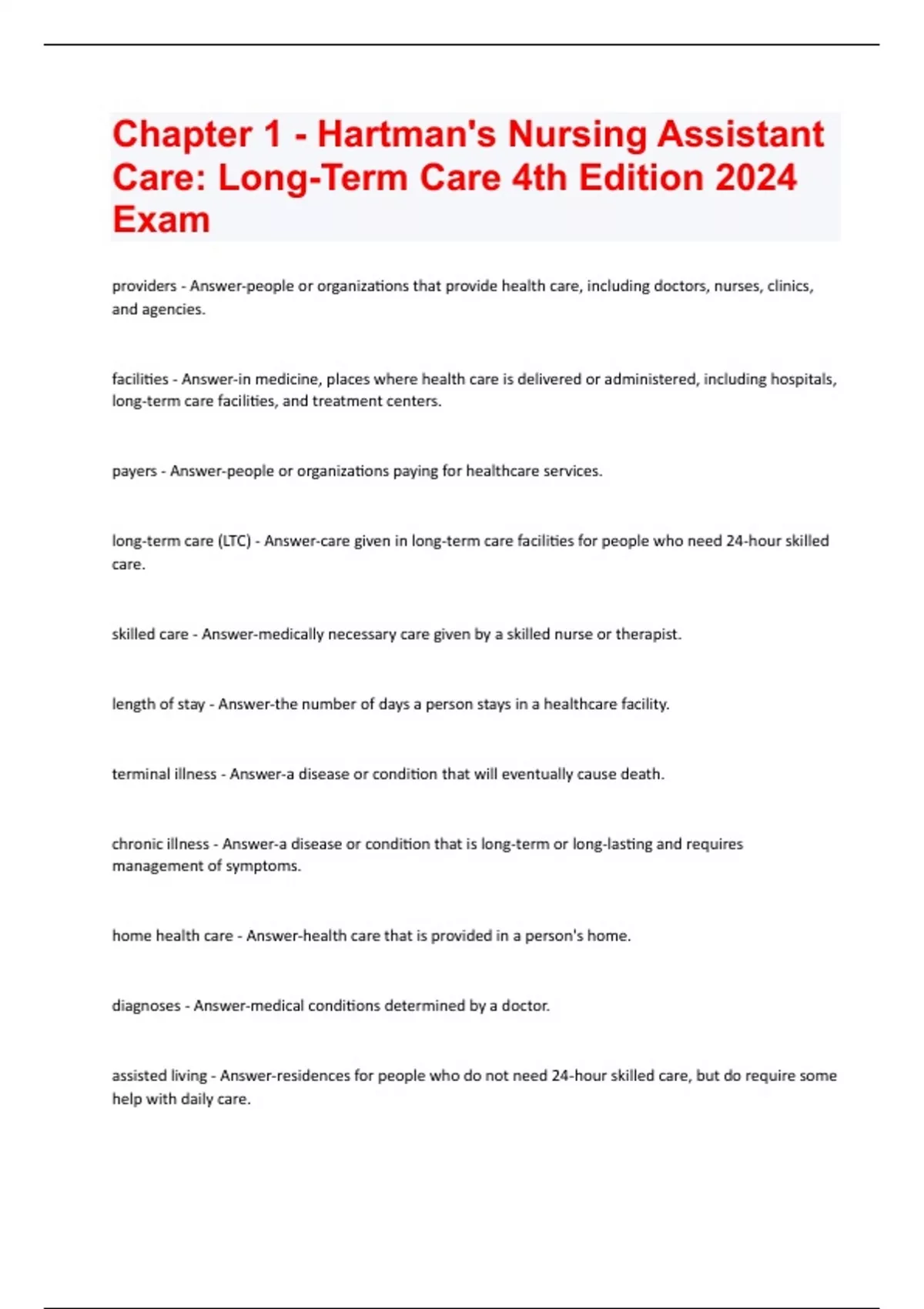 providers - Answer-people or organizations that provide health care, including doctors, nurses, clinics, and agencies. facilities - Answer-in medicine, places where health care is delivered or administered, including hospitals, long-term care facilities, and treatment centers. payers - Answer-people or organizations paying for healthcare services. long-term care (LTC) - Answer-care given in long-term care facilities for people who need 24-hour skilled care. skilled care - Answer-medically necessary care given by a skilled nurse or therapist. length of stay - Answer-the number of days a person stays in a healthcare facility. terminal illness - Answer-a disease or condition that will eventually cause death. chronic illness - Answer-a disease or condition that is long-term or long-lasting and requires management of symptoms. home health care - Answer-health care that is provided in a person's home. diagnoses - Answer-medical conditions determined by a doctor. assisted living - Answer-residences for people who do not need 24-hour skilled care, but do require some help with daily tia - Answer-the serious loss of mental abilities, such as thinking, remembering, reasoning, and communicating. adult day services - Answer-care for people who need some assistance or supervision during certain hours, but who do not live in the facility where care is given. acute care - Answer-24-hour skilled care given in hospitals and ambulatory surgical centers for people who require short-term, immediate care for illnesses and injuries. subacute care - Answer-care given in hospitals or in long-term care facilities for people who need less care than for an acute illness, but more care than for a chronic illness. outpatient care - Answer-care given to people who have had treatments, procedures, or surgeries and need short-term skilled care. rehabilitation - Answer-care given by specialists to help restore or improve function after an illness or injury. hospice care - Answer-holistic, compassionate care given to people who have approximately six months or less to live. managed care - Answer-a system or strategy of managing health care in a way that controls costs. health maintenance organizations (HMOs) - Answer-a method of health insurance in which a person has to use a particular doctor or group of doctors except in case of emergency. preferred provider organizations (PPOs) - Answer-a network of providers that contract to provide health services to a group of people. activities of daily living (ADLs) - Answer-personal daily care tasks, such as bathing, dressing, caring for teeth and nails, eating, drinking, walking, transferring, and ter - Answer-a thin tube inserted into the body to drain fluids or inject fluids. policy - Answer-a course of action that should be taken every time a certain situation occurs. procedure - Answer-a method or way of doing something