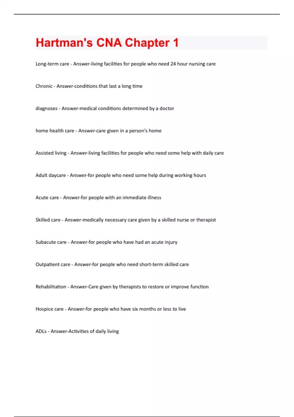 Long-term care - Answer-living facilities for people who need 24 hour nursing care Chronic - Answer-conditions that last a long time diagnoses - Answer-medical conditions determined by a doctor home health care - Answer-care given in a person's home Assisted living - Answer-living facilities for people who need some help with daily care Adult daycare - Answer-for people who need some help during working hours Acute care - Answer-for people with an immediate illness Skilled care - Answer-medically necessary care given by a skilled nurse or therapist Subacute care - Answer-for people who have had an acute injury Outpatient care - Answer-for people who need short-term skilled care Rehabilitation - Answer-Care given by therapists to restore or improve function Hospice care - Answer-for people who have six months or less to live ADLs - Answer-Activities of daily livingCulture change - Answer-the process of adapting services to the beliefs and practices of the patient Medicare - Answer-for people 65 or older or with kidney failure or certain disabilities Medicare Part A - Answer-Helps pay for care in a hospital, skilled nursing facility, or from a home healthy agency or hospice Medicare Part B - Answer-Helps pay for doctor services, medical services, and equipment Medicare Part C - Answer-Allows private healthy insurance companies to provide Medicare benefits Medicare Part D - Answer-Helps pay for medications prescribed Medicaid - Answer-Medical assistance program for low-income people Charting - Answer-Writing down important information about the resident CNA or NA - Answer-Must have at least 75 hours of training Registered Nurse - Answer-A licensed professional who has completed 2-4 years of education Care plan - Answer-Helps the resident achieve his or her goals Licensed Practical Nurse/Licensed Vocational Nurse - Answer-A licensed professional who has completed one to two years of education Physician or Doctor - Answer-A licensed professional who have completed four years of education CNA tasks - Answer-Performing assigned tasks: taking vital signs, helping with adlsRN tasks - Answer-Manages nursing care, also gives meds as prescribed by doctor, writes care plan LPN/LVN tasks - Answer-Gives meds and treatments, may supervise CNAs