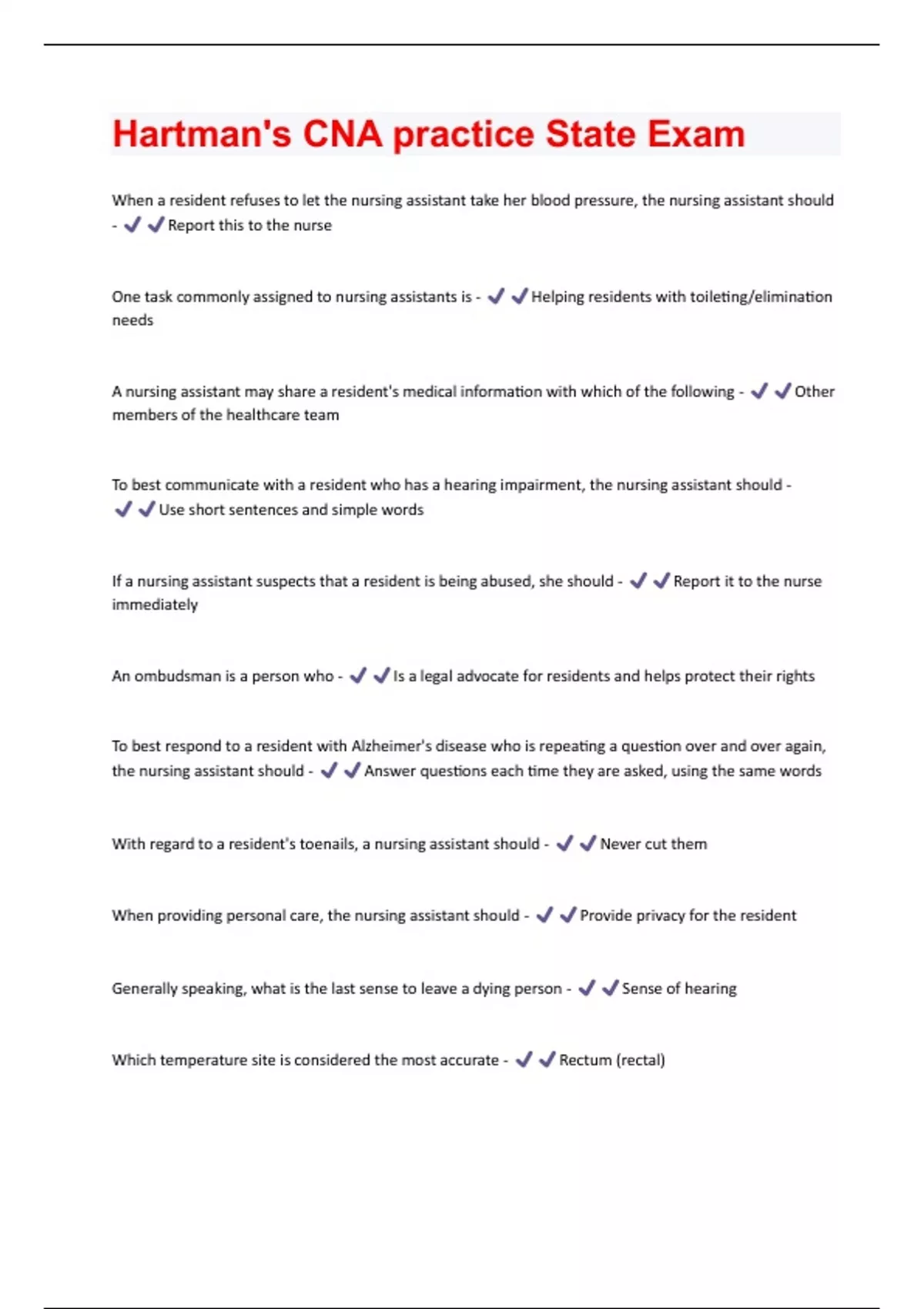 Hartman's CNA practice State Exam Questions & Answers Already Passed!!