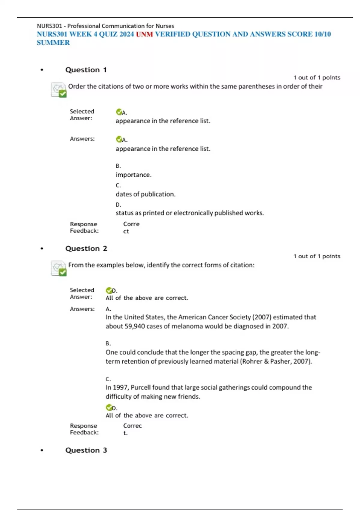 NURS301 WEEK 4 QUIZ 2024 UNM VERIFIED QUESTION AND ANSWERS SCORE 10/10 SUMMER