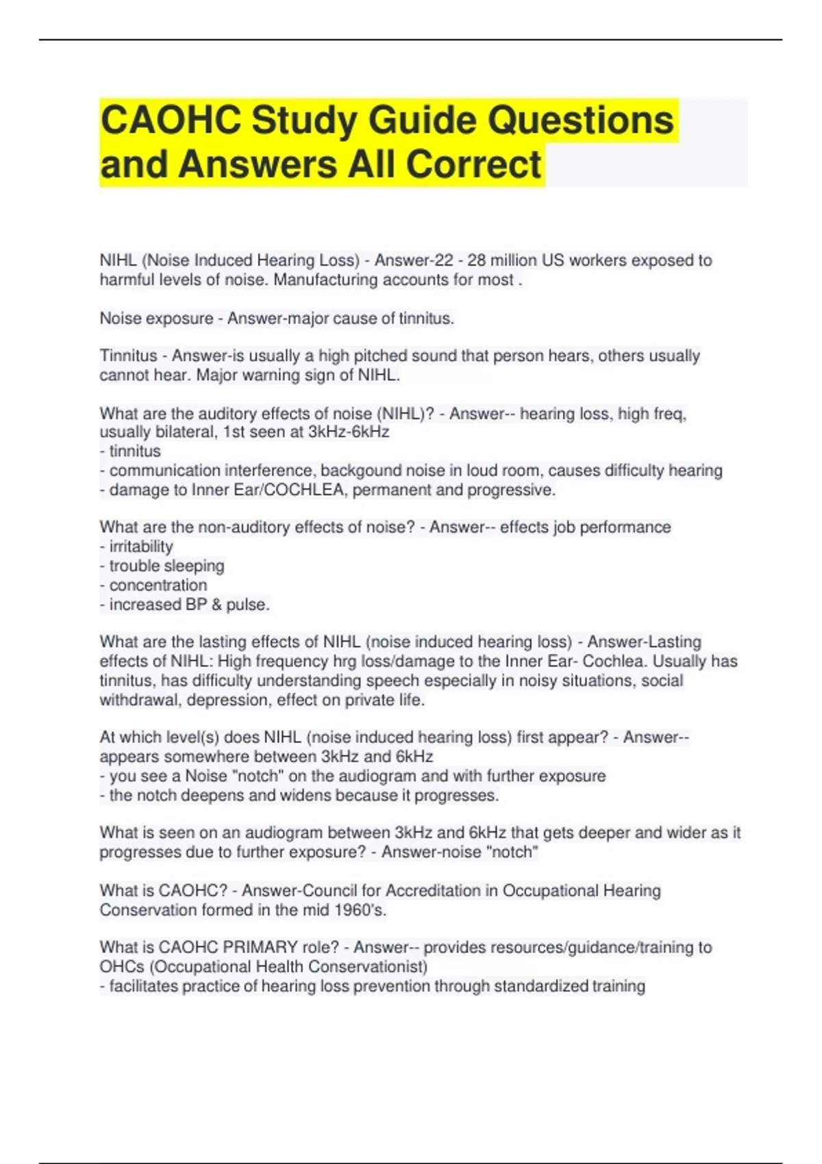 CAOHC Study Guide Questions and Answers All Correct NIHL (Noise Induced Hearing Loss) - Answer-22 - 28 million US workers exposed to harmful levels of noise. Manufacturing accounts for most . Noise exposure - Answer-major cause of tinnitus. Tinnitus - Answer-is usually a high pitched sound that person hears, others usually cannot hear. Major warning sign of NIHL. What are the auditory effects of noise (NIHL)? - Answer-- hearing loss, high freq, usually bilateral, 1st seen at 3kHz-6kHz - tinnitus - communication interference, backgound noise in loud room, causes difficulty hearing - damage to Inner Ear/COCHLEA, permanent and progressive. What are the non-auditory effects of noise? - Answer-- effects job performance - irritability - trouble sleeping - concentration - increased BP & pulse. What are the lasting effects of NIHL (noise induced hearing loss) - Answer-Lasting effects of NIHL: High frequency hrg loss/damage to the Inner Ear- Cochlea. Usually has tinnitus, has difficulty understanding speech especially in noisy situations, social withdrawal, depression, effect on private life. At which level(s) does NIHL (noise induced hearing loss) first appear? - Answer-- appears somewhere between 3kHz and 6kHz - you see a Noise "notch" on the audiogram and with further exposure - the notch deepens and widens because it progresses. What is seen on an audiogram between 3kHz and 6kHz that gets deeper and wider as it progresses due to further exposure? - Answer-noise "notch" What is CAOHC? - Answer-Council for Accreditation in Occupational Hearing Conservation formed in the mid 1960's. What is CAOHC PRIMARY role? - Answer-- provides resources/guidance/training to OHCs (Occupational Health Conservationist) - facilitates practice of hearing loss prevention through standardized training - provides training to CDs and PSs. Which organizations or disciplines are on the CAOHC council? - Answer-CAOHC consists of 2 Reps from each organization; -There are 9 organizations: 1. American Academy of Otolarygology-Head and Neck Surgery 2. American Academy of Audiology; 3. American Association of OHNs; 4. American Coll. of Occupational and Environmental Medicine; 5. American Industrial Hygiene; 6. American Society of Safety Engineers; 7. American Speech-Language-Hearing Association; 8. Institute of Noise Control Engineering; 9. Military Audiology Association Role of OHC - Answer--can do audiometric pure tone air conduction only Role of Audiologist - Answer- Role of Nurse - Answer- Role of Physician/Audologist - Answer-- serves as PS - must supervise audio monitoring of HCP - can also be the HCP Mgr but does not have to be Role of Safety Engineer - Answer- Role of IH (Industrial Hearing) - Answer- Role of Management - Answer- What is the Hearing Conservation Law/Amendment - Answer-The Regulation is CFR 1910.95. NIOSH (National Institute of Safety and Health) - Answer-- determines BEST PRACTICE with no consideration to cost OSHA (Occupational Safety and Health Administration) - Answer-- writes regulations - enforces & issues citation - considers economic impact to companies OHC (Occupational Health Conservationist) - Answer-- must follow the most STRINGENT standard of the Hearing Conservation Law - According to OSHA, takes care of RECORDKEEPING What is PEL? - Answer-- any sound above 90 dBA 8 hour TWA - needs HP (Hearing Protection) What is the Action Level? - Answer-- 85dBA or greater 8 hour TWA - requires employer to start HCP and make HPDs available. What is the Exchange Rate - Answer-- 5dB US - 3dB Europe and some professional groups Hearing Conservation Amendment - Answer-The Regulation is CFR 1910.95. When does HCP (Hearing Conservation Plan) begin? - Answer-- if you cannot engineer noise out down below AL - if exposure is 8 hr-TWA at 85dBA or greater What are the elements of a HCP (Hearing Conservation Plan) ? - Answer-- Noise measurement, noise control - audiometric monitoring, - HPDs (Hearing Protection Devices) - Worker training - Recordkeeping - Program Evaluation dBC scale - Answer-- more linear and - used for determinations of NRR (Noise Reduction Rating) and - used for determinations of community noise What is a PS (Program Supervisor) - Answer-- An Audiologist/Physician - supervises audio monitoring of HCP (Hearing Conservation Program) - can also be the HCP Mgr but does not have to be 15. State and local requirements - Answer-must MEET or EXCEED federal standards OHC/Employers - Answer-must follow MOST federal standards DoD - Answer-- different than OSHA- - more proactive; - 3 dB Exchange Rate - lower PEL. - Answer-State and local requirements must MEET or EXCEED federal standards. OHC/Employers must follow MOST DOD different than OSHA- more proactive; 3 dB Exchange Rate, lower PEL. 23. - Answer-You have 6 months to establish a baseline but if you use a mobile service, you have ONE YEAR to establish the baseline! 18. - Answer-PEL - 90 dBA 8 hour TWA- above that needs HP; Action Level:-85dBA or greater 8 hour TWA -requires employer to start HCP and make HPDs available. Exchange Rate - 5db US; 3dB Europe and some professional groups. Physics of Sound/Anatomy: - Answer- 20. - Answer-To find out an individual's noise exposure, DOSIMETRY is best. 21. - Answer-Weighting scales when measuring noise: dbA-used for regulatory OSHA compliance in hearing conservation