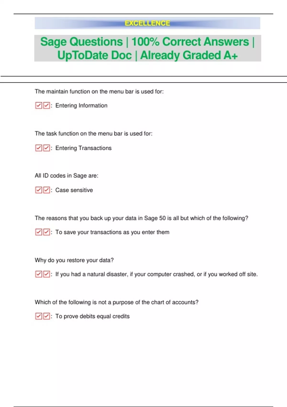 The maintain function on the menu bar is used for: ☑: Entering Information The task function on the menu bar is used for: ☑: Entering Transactions All ID codes in Sage are: ☑: Case sensitive The reasons that you back up your data in Sage 50 is all but which of the following? ☑: To save your transactions as you enter them Why do you restore your data? ☑: If you had a natural disaster, if your computer crashed, or if you worked off site. Which of the following is not a purpose of the chart of accounts? ☑: To prove debits equal credits EXCELLENCE Why is the correct classification for accounts critical when using computerized accounting? ☑: If the classification is incorrect, the accounting records will be incorrect causing the financial statements to be incorrect. Where do you go in Sage 50 to set the Accounting Period? ☑: Both Tasks, System, Accounting Period and Accounting Period at the top of the Navigators If you do not see a GL account column on a sales invoice, you need to: ☑: Click on Options, Global and uncheck the hide A/R and Payroll accounts What is the purpose of Analysis on the menu bar? ☑: To see how the company is doing through charts, graphs and ratios. Record adjusting entries. ☑: General Journal Purchase of merchandise on account from a vendor. ☑: Purchases Journa