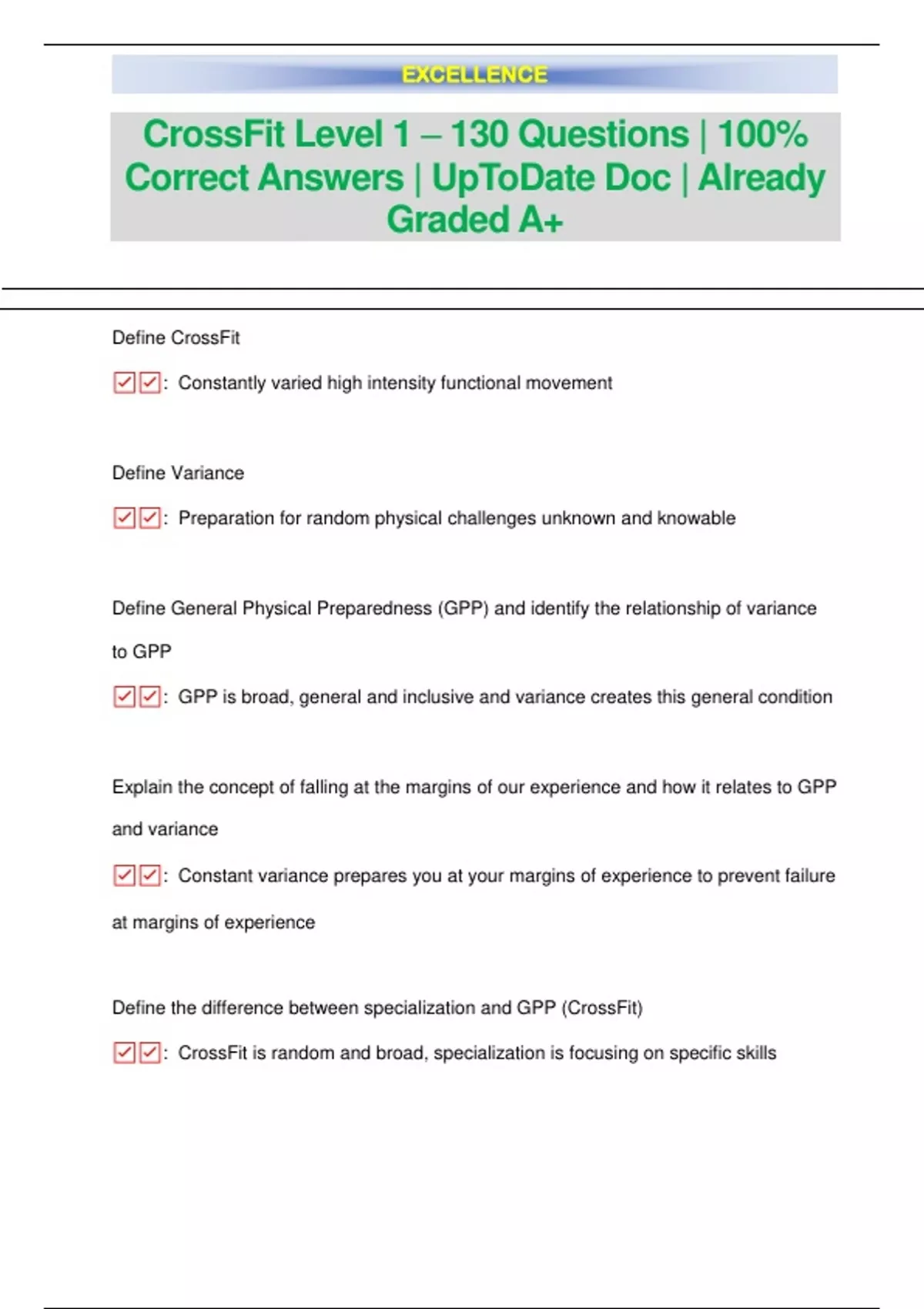CrossFit Level 1 – 130 Questions | 100% Correct Answers | UpToDate Doc | Already Graded A+