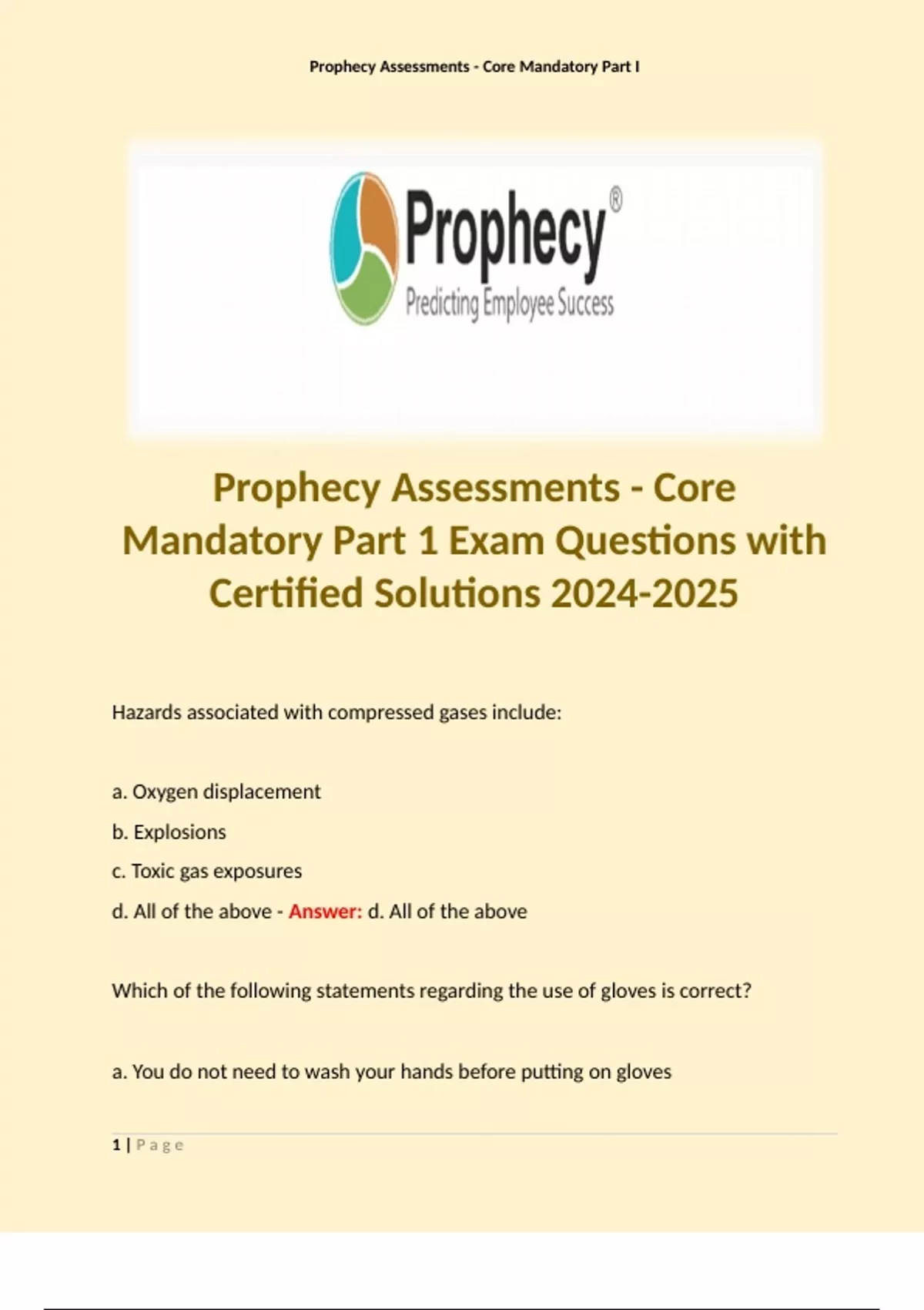 Prophecy Assessments - Core Mandatory Part 1 Exam Questions with Certified Solutions . Terms like: Hazards associated with compressed gases include: a. Oxygen displacement b. Explosions c. Toxic gas exposures d. All of the above - Answer: d. All of the above