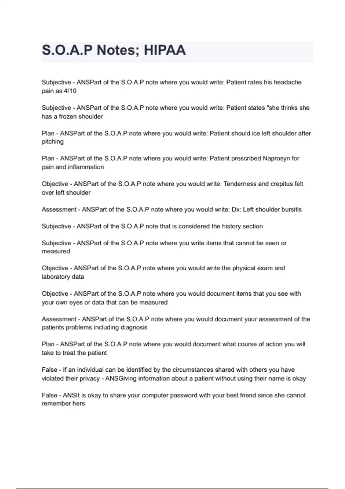S.O.A.P Notes; HIPAA questions and answers A+ score assured 2024/2025
