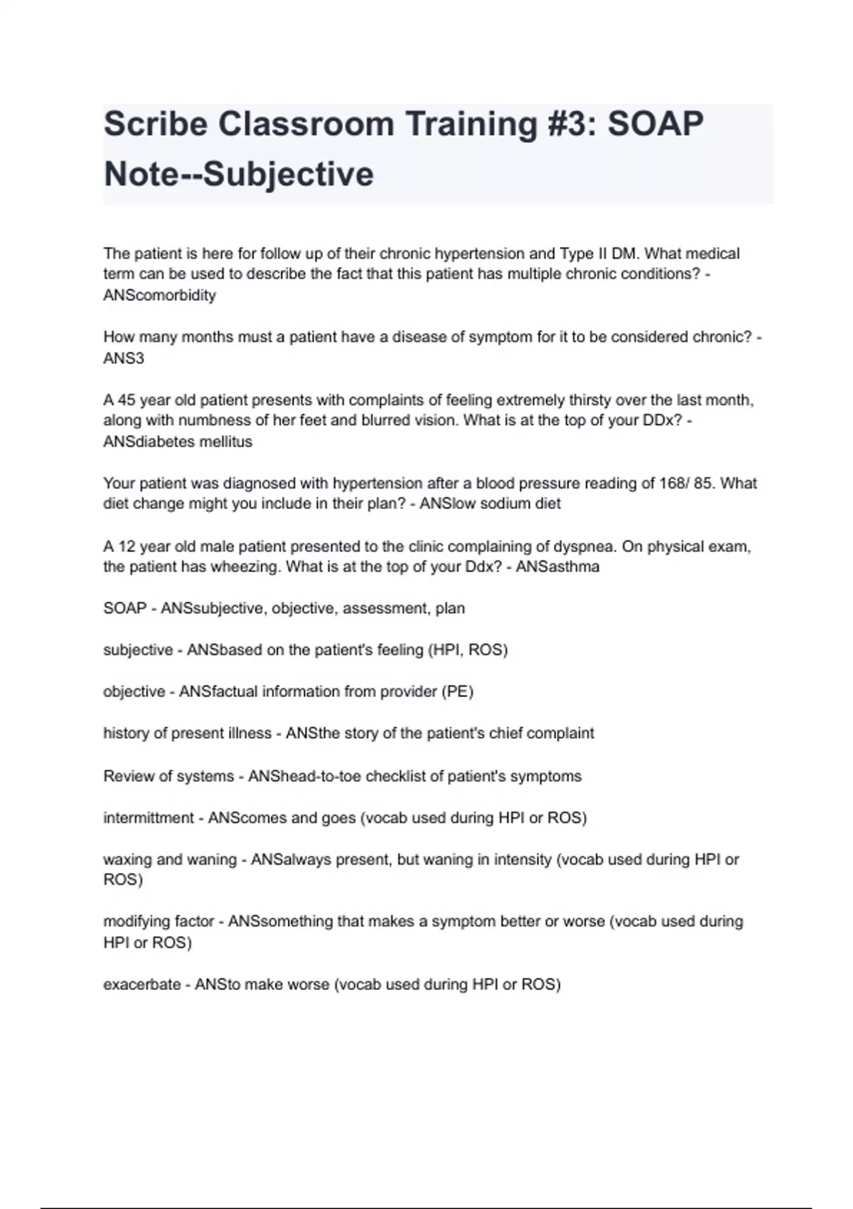 Scribe Classroom Training #3: SOAP Note--Subjective questions and answers A+ score assured 2024/2025