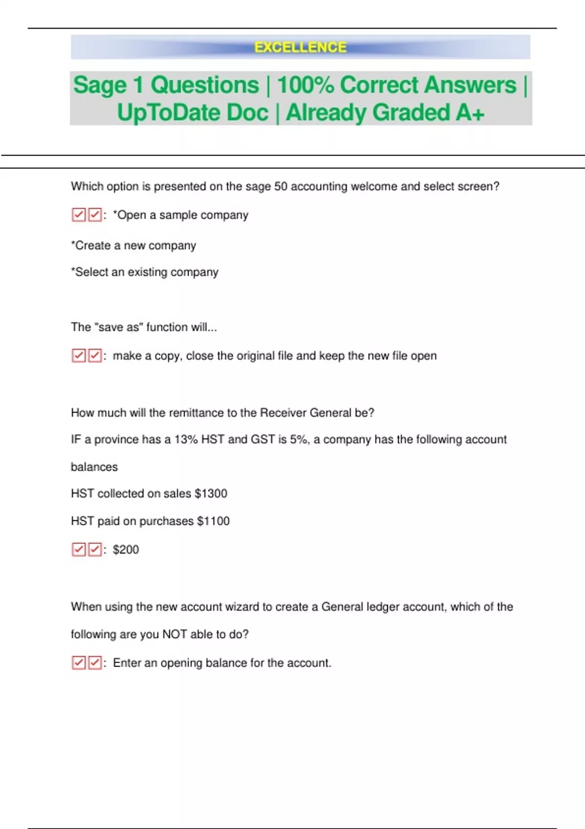 Which option is presented on the sage 50 accounting welcome and select screen? ☑: *Open a sample company *Create a new company *Select an existing company The "save as" function will... ☑: make a copy, close the original file and keep the new file open How much will the remittance to the Receiver General be? IF a province has a 13% HST and GST is 5%, a company has the following account balances HST collected on sales $1300 HST paid on purchases $1100 ☑: $200 When using the new account wizard to create a General ledger account, which of the following are you NOT able to do? ☑: Enter an opening balance for the account. EXCELLENCE When moving the mouse pointer over a report and it changes to an icon looking like a magnifying glass with a plus sign inside it, you can... ☑: See the available "drill down reports" Accounts that can be deleted and accounts with a negative balance are examples of what type of reports? ☑: Management reports Account types for GST Charges on Sales, GST Paid on Purchases and GST owing(refund) should be... ☑: Account types A,A,S for the above order. When changing the default settings to reflect company information, such as name and address, fiscal dates, screen display preferences and Chart of Accounts, what menu must you select? ☑: Setup